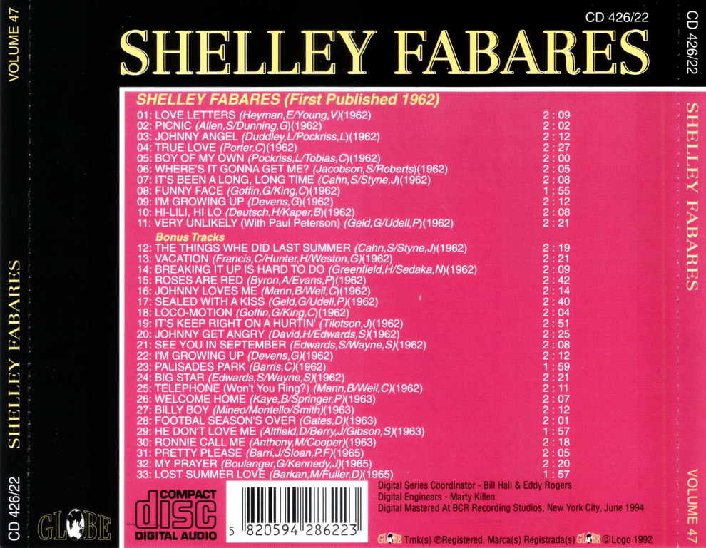 Die Schauspielerin und Sängerin Shelley Fabares wurde am 19. Jänner 1944 in Santa Monica, Kalifornien, als Michele Ann Marie Fabares geboren. Bereits mit 18 Jahren erreichte sie mit ihrem Song "Johnny Angel" die oberste Spitze der Charts. Als Schauspielerin war sie in drei Filmen auch die Partnerin von Elvis Presley allerdings zu einer Zeit wo er als King Of Rocknroll bereits in Pension, aber als Schauspieler und arrivierter Schlagersänger noch voll im Geschäft war. Die erwähnten drei Filme hießen "Girl Happy" [Kurven-Lilly] (1965), "Spinout" [Sag niemals ja] (1966) und "Clambake" [Nur nicht Millionär sein] (1967).