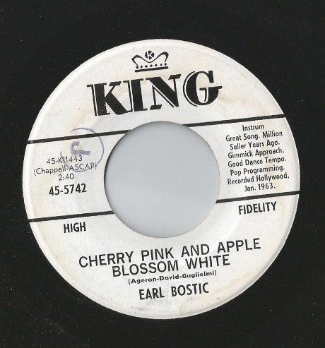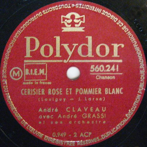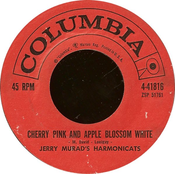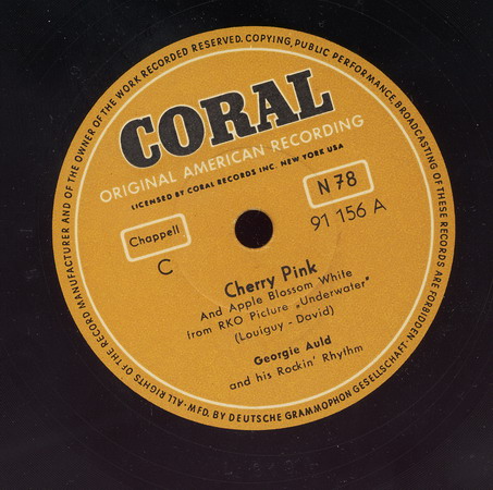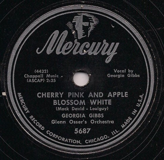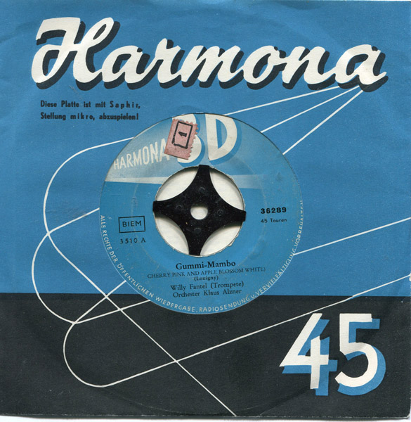 "Cherry Pink And Apple Blossom White" oder der "Gummi-Mambo" wie er bei uns oft genannt wird stammt eigentlich aus Frankreich und wurde 1950 von Louiguy, das war das Pseudonym von Louis Guglielmi, als "Cerisier rose et pommier blanc" geschrieben und nach meinen derzeitigen Informationen von André Claveau mit einem Text von Jacques Larue auf Platte gebannt (Schellack: POLYDOR 560.241).