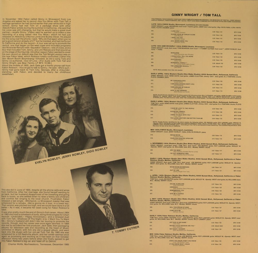 Die Country-Sängerin Ginny Wright wurde 1. August 1932 in Twin City, Georgia, geboren. Neben Ihren Solo-Einspielungen fungierte sie auch sehr oft als Duett-Partner für Jim Reeves, Tom Tall etc.