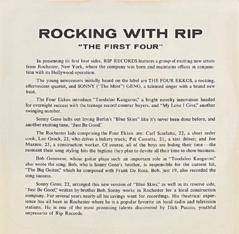Ich nehme an, dass die Four Ekkos auf den Labels FINE & LABEL ident sein dürften, da diese beiden Labels "verwandt" sind. Bei RIP & BRUNSWICK dürfe es sich um zwei andere Formationen handeln.