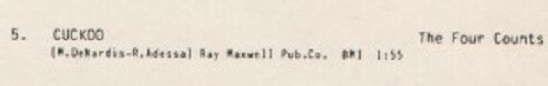 Der Gruppenname "Four Counts" war auch relativ beliebt. In der für uns maßgeblichen Ära konnte ich vier Formationen orten, die sich diesen Namen angeeignet haben.