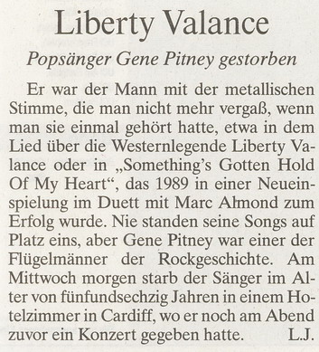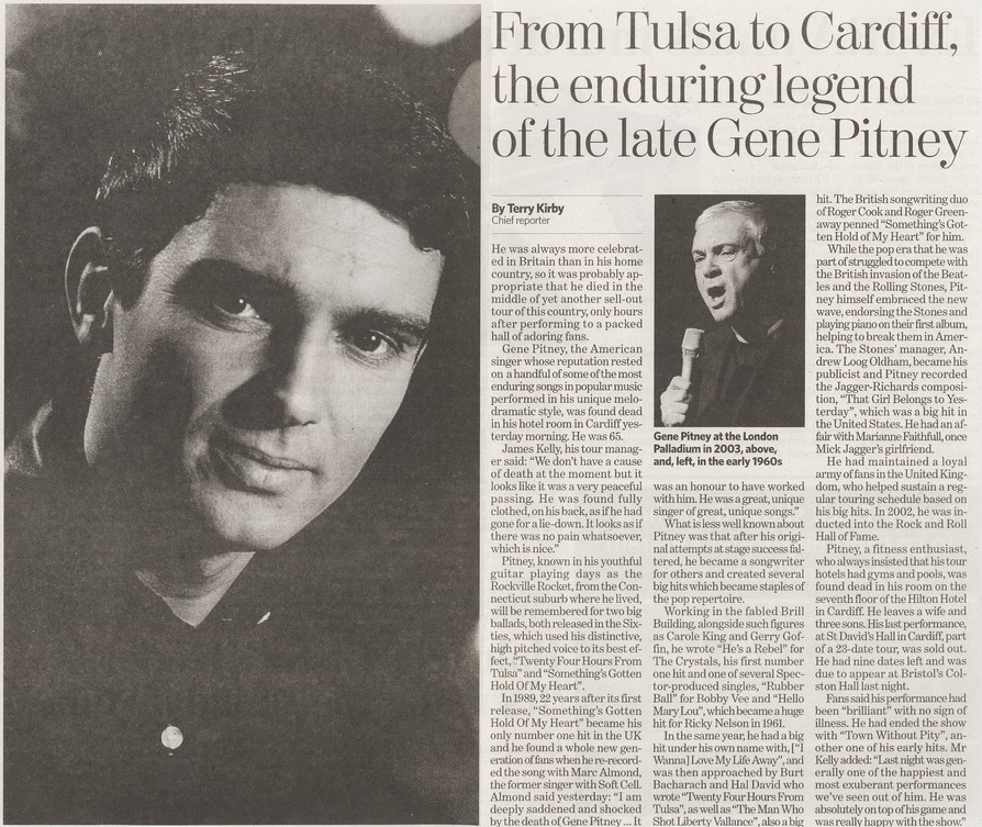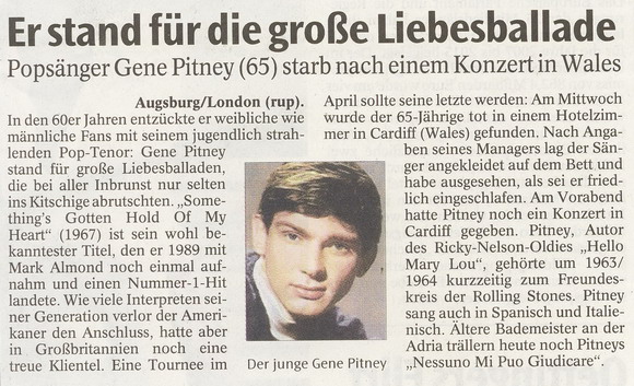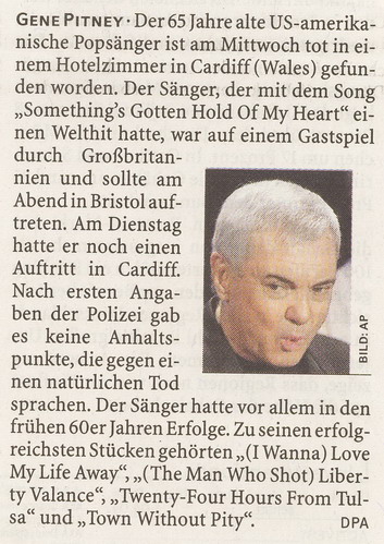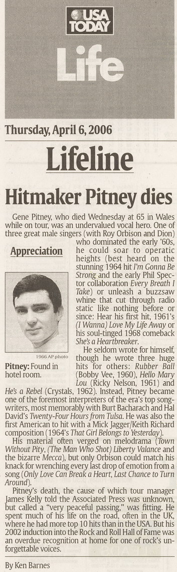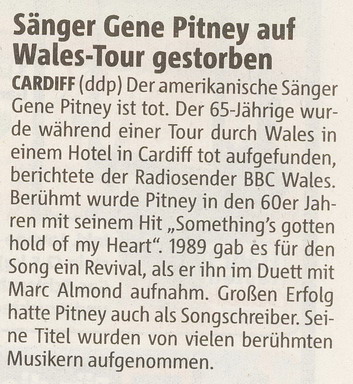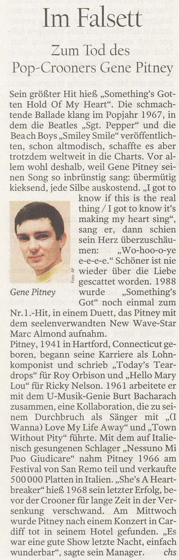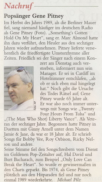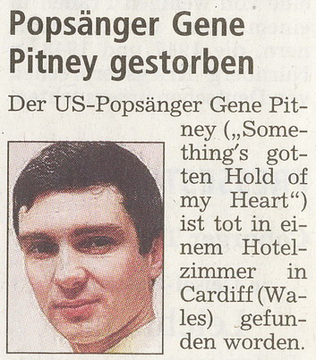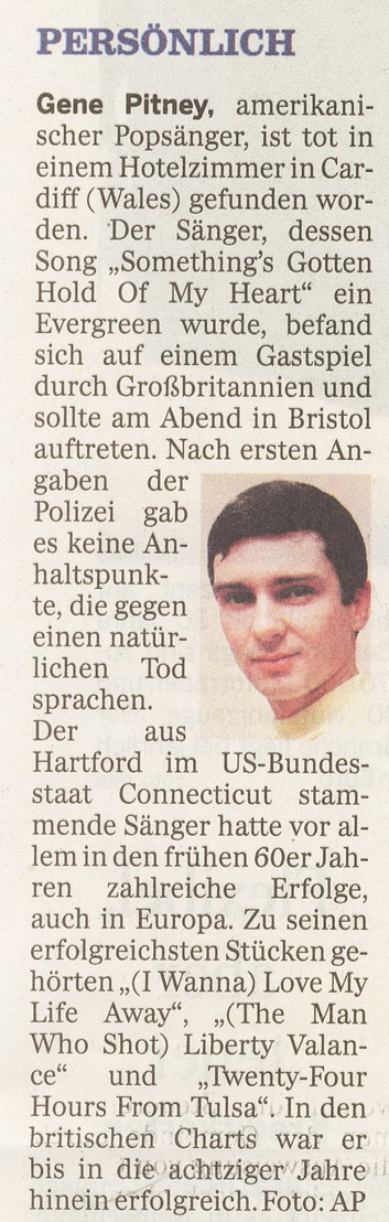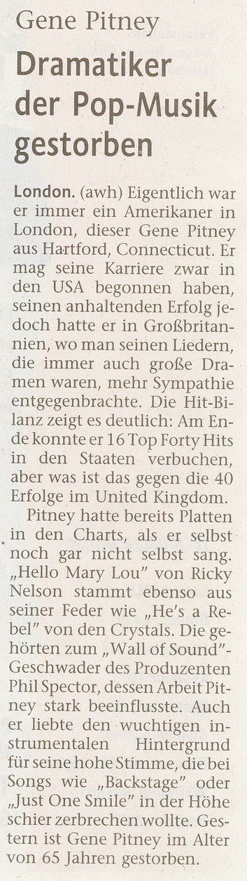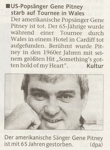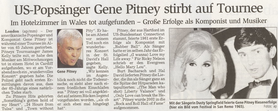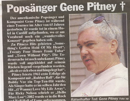 Überhaupt schien Pitney, 1941 im US-Bundesstaat Connecticut geboren, besonders die Briten zu begeistern. Seine größten Erfolge feierte er in Sechzigern abseits der Metropole London in den südenglischen Küstenstädten mit ihren Strandpromenaden und der spießigen Welt des gemähten Rasens. Auch in den vergangenen Wochen tingelte Pitney wieder durch die Tanzhallen der britischen Badeorte. Nach einem Auftritt im walisischen Cardiff sollte er heute Abend in einem Club in Bristol auftreten. Doch Pitney wurde in seinem Hotelzimmer tot aufgefunden. Offenbar ist er friedlich eingeschlafen. Er wurde 65 Jahre alt.