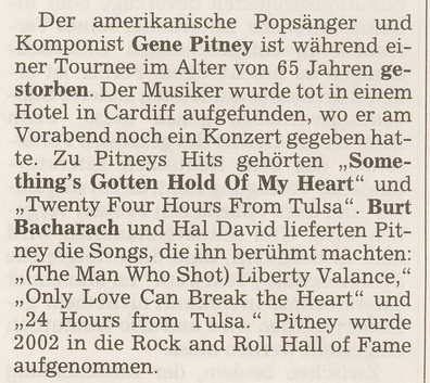 Im Schatten Roy Orbisons: Der amerikanische Sänger Gene Pitney machte sich in den sechziger Jahren mit herzzerreißenden Pop-Balladen wie "Something's Gotten Hold Of My Heart" einen Namen. Am 05. April 2006 starb Pitney überraschend im Alter von 65 Jahren.