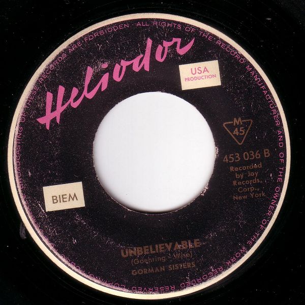 Von Barbara und Viv Gorman sind mir vier Singles bekannt. Eine Hälfte ihrer zweiten JOY-Single gab es sogar bei uns, nur die zweite Hälfte "Unbelievable" ist in den USA nirgends zu finden. Dass der Weihnachtstitel "Daddy Is My Santa Claus" bei uns im Sommer etwas unpassend gewesen wäre ist ganz klar, offensichtlich wurde die neue B-Seite nur für uns gestrickt. Eigentlich sollte es mich nicht wundern, denn gerade bei HELIODOR gibt es mehr solcher Beispiele wie zum Beispiel die zwei Ricky Nelson-Titel von Johnny Tillotson die zwar in den USA auftauchten, allerdings weit später als bei uns. Ein noch besseres Beispiel wo in den USA nichts auftauchte sind Johnny & The Hurricanes mit "Du, du liegst mir im Herzen" und "Oh du lieber Augustin", um einige Beispiele in Erinnerung zu rufen.