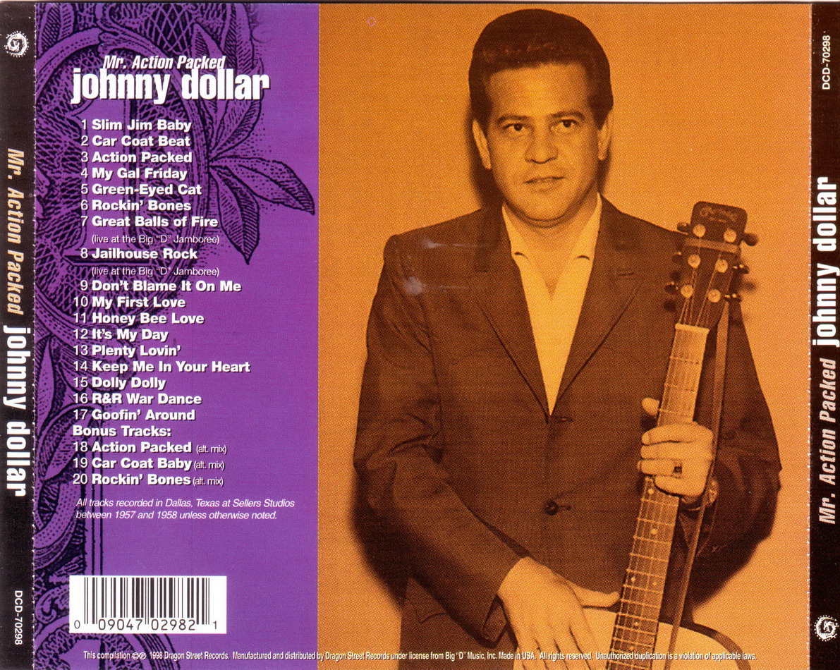 Dragon Street DCD-70258 Mr. Action Packed: Slim Jim Baby; Car Coat Beat; Action Packed; My Gal Friday; Green Eyed Cat; Rockin' Bones; Don't Blame It On Me; Great Balls Of Fire [Live]; Jailhouse Rock [Live]; It's My Day; Keep Me In Your Heart; Honey Bee Love; Plenty Lovin'; My First Love; Dolly Dolly; R & R War Dance; Goofin' Around; Action Packed [Alt]; Car Coast Baby [Alt]; Rockin' Bones – 93 (mostly demos. Recorded 1957-58 Dallas, Tx, reissued in UK on Rollercoaster RCCD 3033 in 1998)