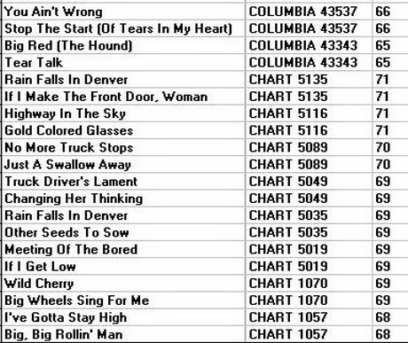 Chart CHS-1023 Big Rig Rollin' Man: Big Rig Rollin' Man; Wild Cherry; Other Seeds To Sow; Truck Driver's Lament; Meeting Of The Bored; I've Got To Stay High; Big Wheels Sing For Me; Rain Falls In Denver; Changing Her Thinking; Highway In The Sky; You've Got What It Takes; If I Get Low Enough – 11-69 (reissued on Brylen BN-4465 Down Life's Highway in 1982)