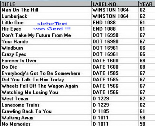 ALBUMSDate TEM-3009/TES-4009 Johnny Dollar: The Wheels Fell Off The Wagon Again; Watching Me Losing You; It's Good; Our House; Numbers Lil; Forever Is Over; Everybody's Got To Be Somewhere; Did You Talk To Him Today; Gonna Come In Like A Lion; Do-Die – 11-67 (MX: XSM-119717/8 )