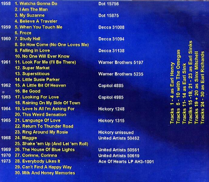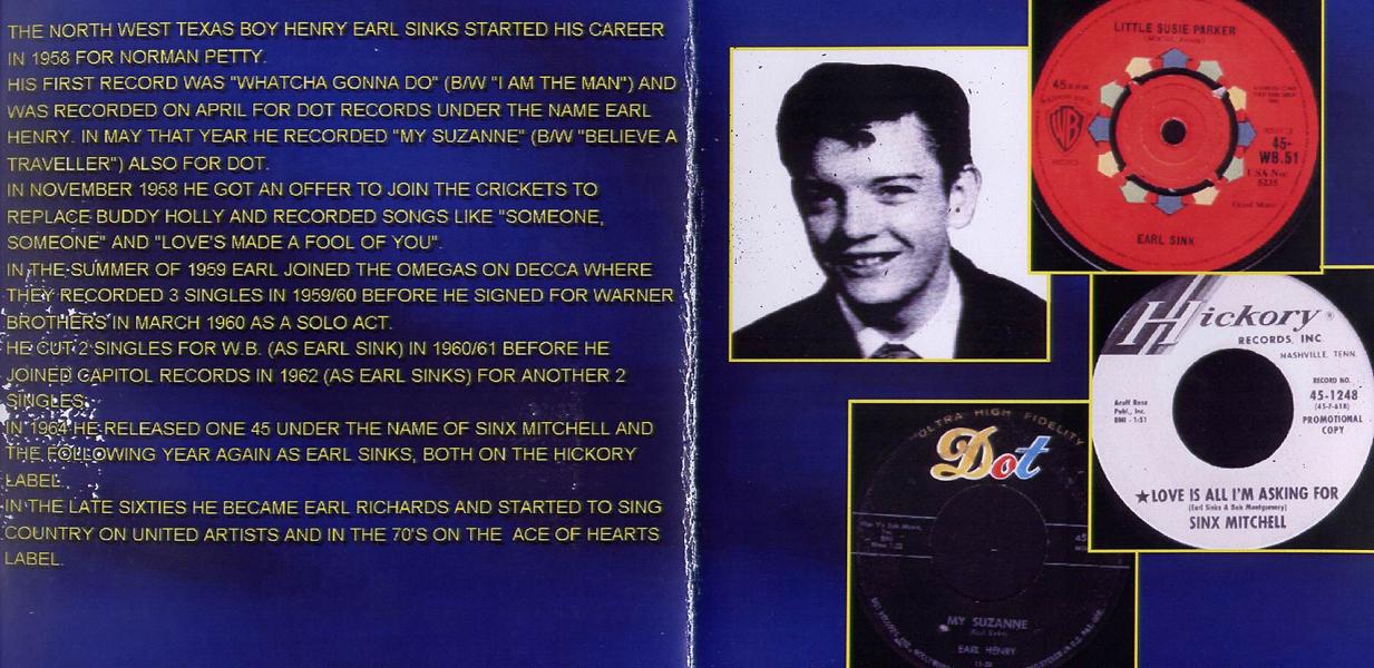 Der Song-Writer, Schauspieler und Sänger Earl Sinks wurde am 1. Jänner 1940 in Whitarral, Texas, als Henry Earl Sinks geboren. Neben seinen Solo-Einspielungen hat er auch bei diversen Formationen als Sänger mitgewirkt, wie beispielsweise bei den Crickets. Er verwendete auch mehrere Pseudonyme, unter anderem Earl Henry oder den Gruppennamen The Omegas mit Musikern wie Boots Randolph etc.