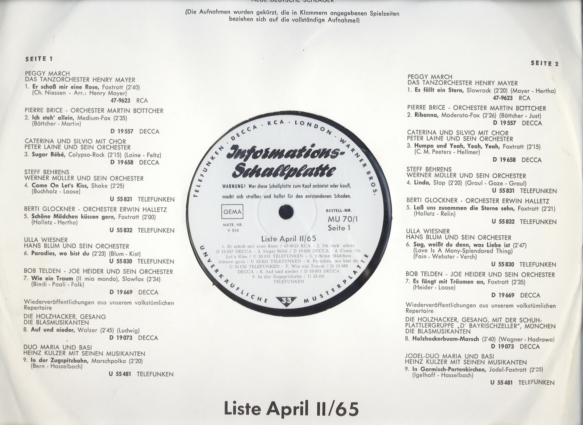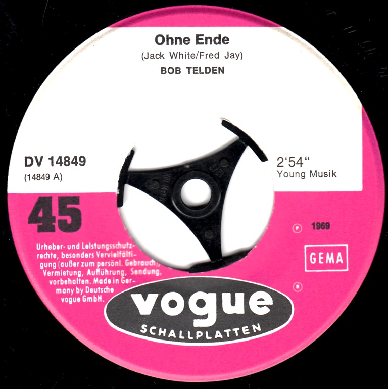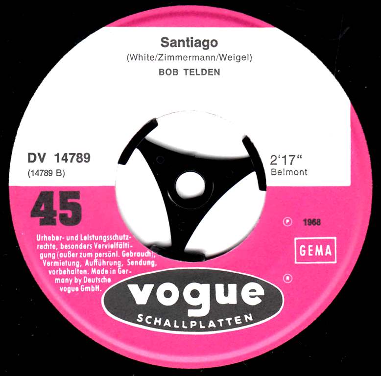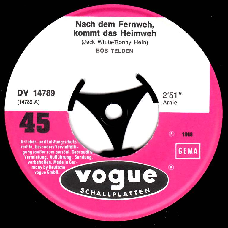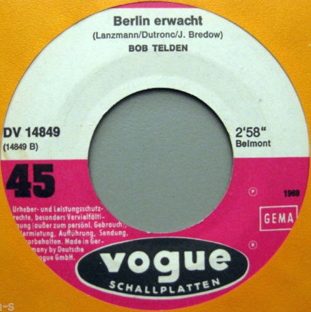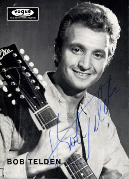 TELDEN, BOB (WOLFGANG THÜMLER) * 20.07.1941, Sänger aus Helmstedt, Wechsel nach Berlin, bis 1966 Sänger bei der Beatgruppe The PHANTOMS, Auftritte im Berliner Riverboat, 1965 Decca, 1966/67 Metronome, Teilnahme beim europäischen Nachwuchs-Sängerwettstreit "Coup d'Europe" in Knokke (& TONY MARSHALL u. MARION), 1967 Tip, 1968-70 Vogue (u.a. 11125 "Sand In Meinen Haaren"/"Take It Easy", Zusammenarbeit mit JACK WHITE), Bellaphon, 1971 Ariola als ROBBY WINTER, memory Nr. 63, "Berlin Erwacht (Il Est Cinq Heures, Paris s´eveille)"
