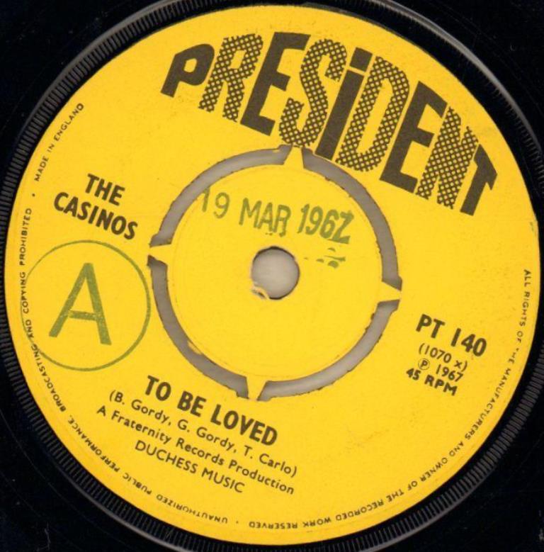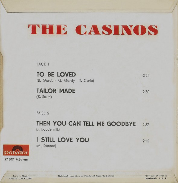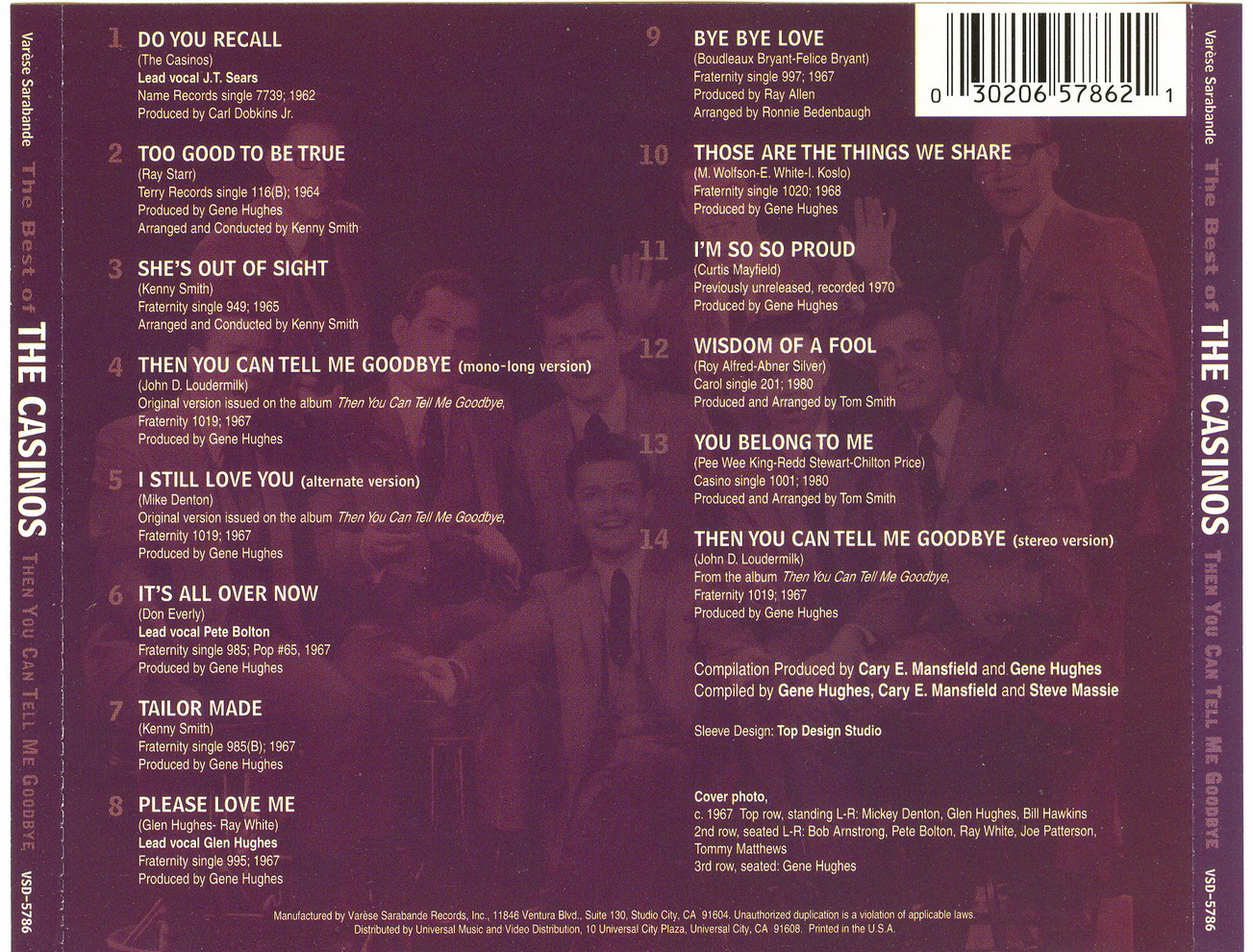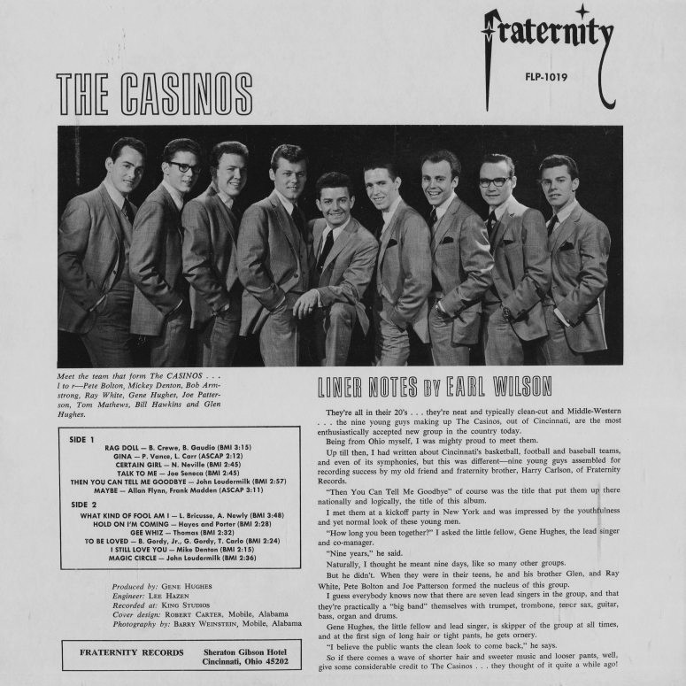 The Casinos was a nine-member doo-wop group from Cincinnati, Ohio, led by Gene Hughes included Bob Armstrong, Ray White, and Pete Bolton. Ken Brady joined the group as the lead singer until 1965. Pete Bolton was replaced at the time by Jerry Baker. Ken Brady left the group to perform as a solo artist and Gene Hughes returned and the group became a nine piece group. They are best known for their John D. Loudermilk-penned song "Then You Can Tell Me Goodbye," which hit number 6 on the Billboard Hot 100 chart in 1967, well after the end of the doo-wop era.