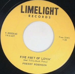 auf Limelight 3005 vom Juni ‘58 mit “Five Feet Of Lovin’”, der Stimme nach könnte Freddy Robinson auch schwarz sein, und möglicherweise ist er auch identisch mit jenem Freddy Robinson, der in den 60er Jahren als Gitarrist Soul-Aufnahmen in Chicago machte und später in der Begleitband von Ray Charles mitwirkte?