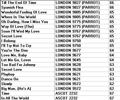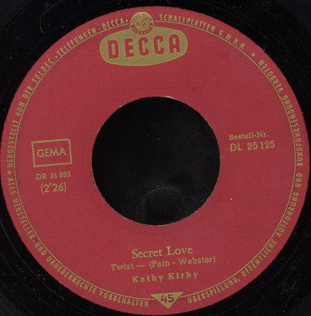 Kathy Kirby ist eine englische Sängerin, die hier den Titel "Secret Love" in einer interessanten uptempo Version abliefert. Der Titel fängt allerdings langsam an - und die Stimme von Kathy lässt schlimmes befürchten. Dann jedoch folgt ein Tempowechsel und die Nummer geht richtig los. Eigentlich wegen der Gitarrenbegleitung interessant. Gitarrensounds faszinieren mich irgendwie...
