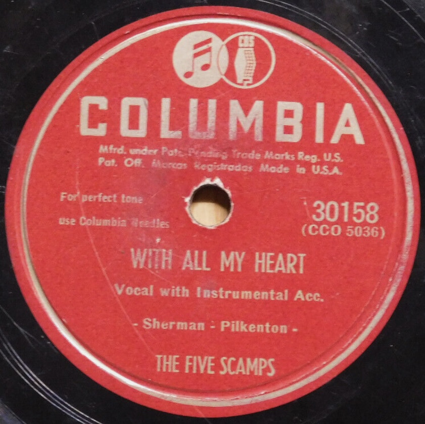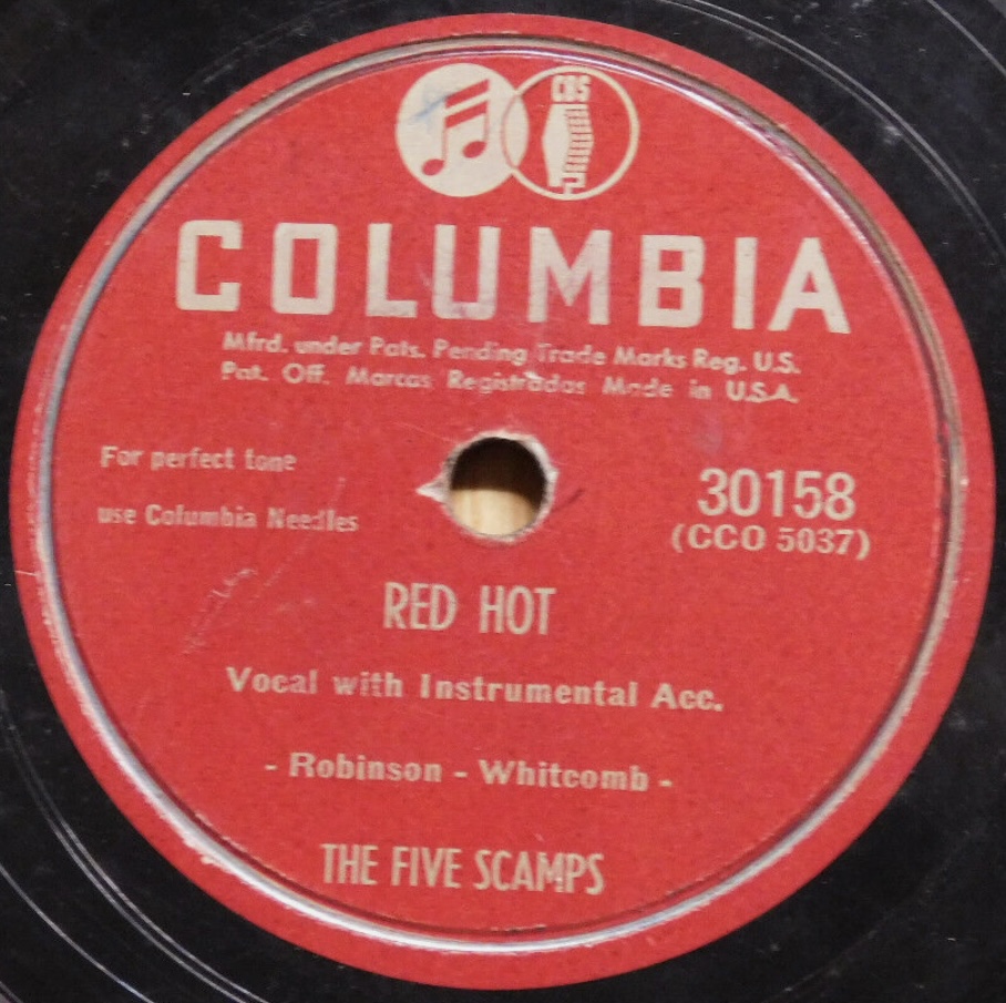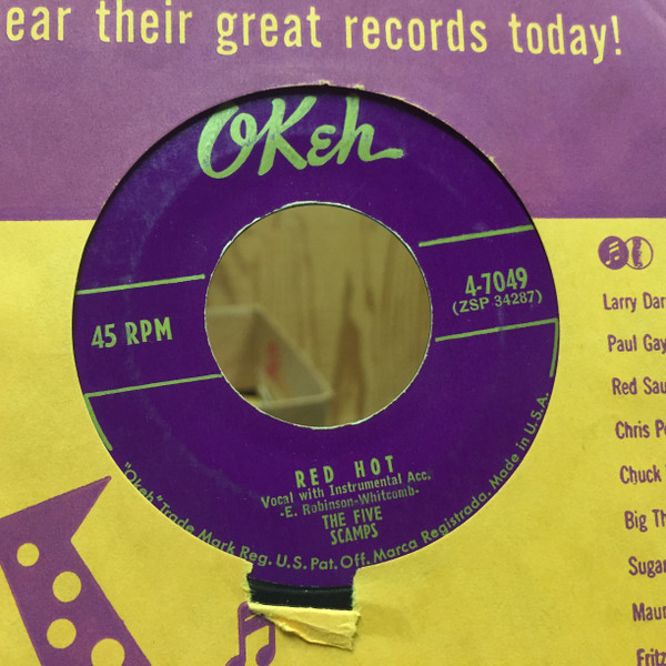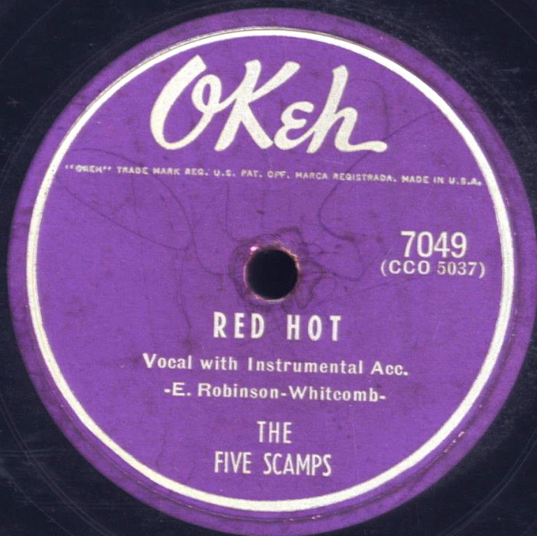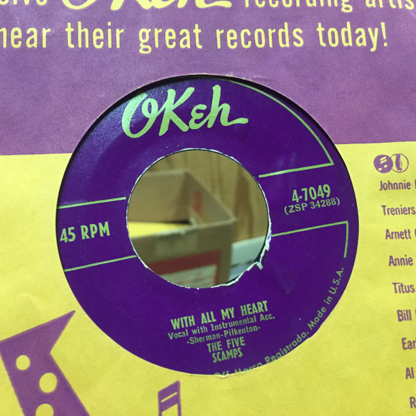 Die beiden Aufnahmen ihrer zweiten 45er auf OKEH vom Dezember 1954, gab es bereits im März 1949 aufCOLUMBIAals Schellack. OKEH 12 54....4-7049....THE FIVE SCAMPS..Red Hot (ZSP 34287)/With All My Heart (ZSP 34288) (78: COLUMBIA 30158)