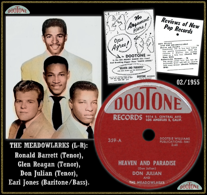 Die Meadowlarks, ein Trio bestehend aus Don Julian, Lead, Ronald Barrett, Tenor, sowie Earl Jones, Bariton/Bass, kamen etwa 1953 in Fremont High in Los Angeles zusammen. Kurz darauf fanden sie noch in Randoph "Randy" Jones einen eigenen Bass-Singer. Cornel Gunter vermittelte das nunmehrige Quartett an die Bihari-Brüder, wo die ersten Aufnahmen eingespielt und auf RPM veröffentlicht wurden. Bei beiden Titel ihrer ersten Single war Ronald Barrett noch der Lead-Sänger.