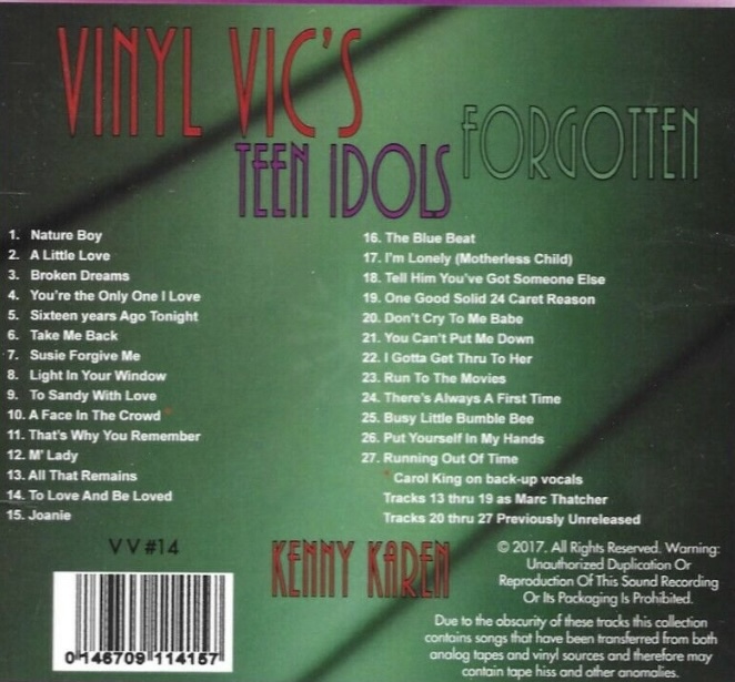 Der Songwriter und Sänger Kenny Karen wurde am 8. Jänner 1944 in Troy, New York, als Chaim Hillel Teicher geboren. 1949 zog die Familie nach Montreal, Kanada, wo Ken auch aufwuchs. Mit 11 Jahren schrieb er bereits seine ersten Songs und 1958 machte er bei BARRELL Records in Kanada seine ersten Platten-Aufnahmen, die aber unveröffentlicht blieben. Erst von den am 8. September 1959 in den Bell Sound Studios in New York City eingespielten Songs gab es bei STRAND zwei Singles. 1961 kam er in den "Stall" von Nevis-Kirshner und unterschrieb einen Vertrag als Sänger/Songwriter bei COLUMBIA. Etwa bis 1966 war er nebenbei auch als Demo-Sänger für Elvis-Filme und für Burt Bacharach tätig.