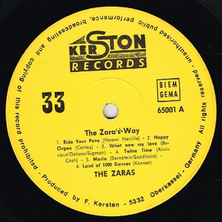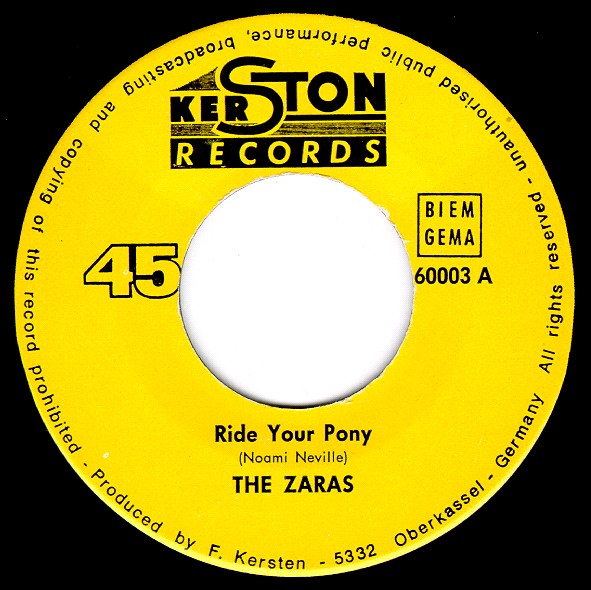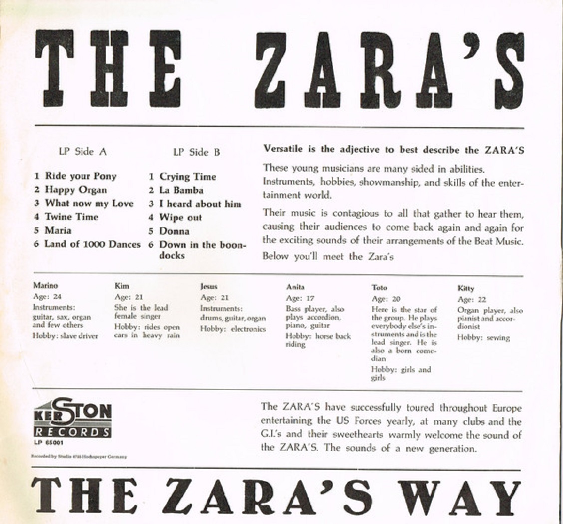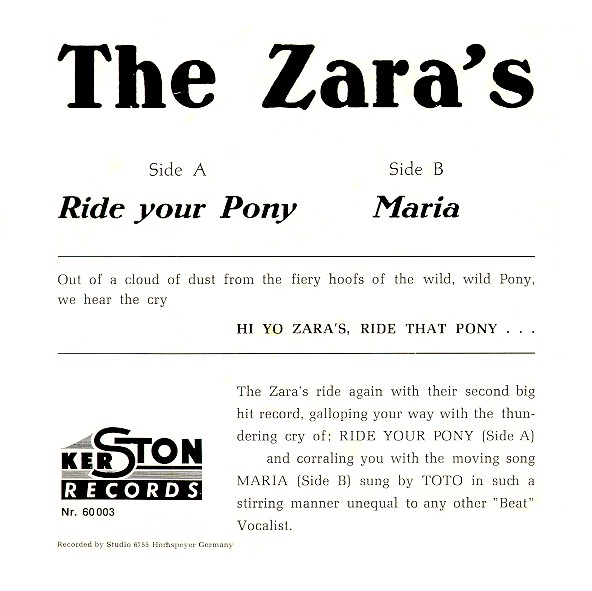 The Zara's (merkwürdige Schreibweise mit dem Apostroph...) waren eine Band, die vermutlich aus Spanien stammte und die in Deutschland aktiv war, als "Showband" überwiegend in Clubs, in denen die amerikanischen GIs verkehrten. Das kleine Label Kerston veröffentlichte 1965 die Single "Ride Your Pony". Auf der Cover-Rückseite steht etwas von "their second big hit record", aber ich habe weder bei Kerston noch irgendwo anders eine weitere Single gefunden... von "big hit record" mal ganz zu schweigen. Doch bei Kerston hatte man sich von der Band wohl einiges versprochen, denn außer der Single veröffentlichte man noch im selben Jahr gleich zwei LPs... ob sich die Investition gelohnt hat, mag bezweifelt werden.