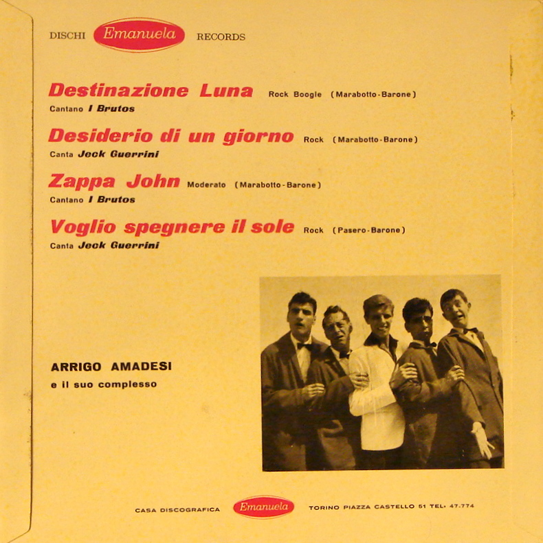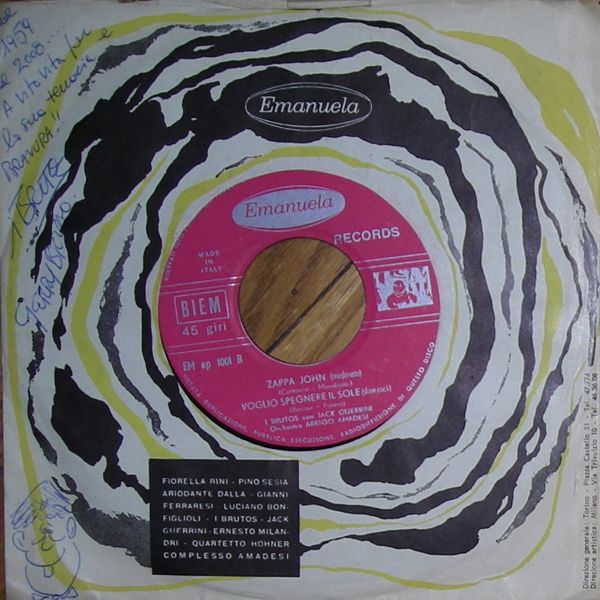 Das Werbeplatten-Geschäft dürfte in deutschen Landen ganz gut gegangen sein, wie man den garnicht so wenigen Beiträgen unserer Mitglieder über dieses Thema entnehmen kann. Bei uns in Österreich dürfte es nicht viel anders gewesen sein, aber aus Österreich gab es bisher noch keinen derartigen Beitrag. Auf der heutigen Börse ist mir eine so eine Werbeplatte aus Wien angeboten worden und da konnte ich nicht widerstehen. Die Firma heißt "HEFA ERSATZTEILE WIEN", klingt ja sehr musikalisch, und die Musikstücke hat sie sich ganz einfach aus Italien geholt und zwar vom italienischen Label EMANUELA, welches mir bisher unbekannt war. Die Interpreten hießen I Brutos und waren eine komödiantische Musikgruppe, die meist auf Bühnen auftrat. Das dürfte auch der Grund dafür sein, dass es nicht sehr viele Platten von ihnen gab. Bis 1963 konnte ich lediglich eine EP aus 1960 (siehe Scan aus dem Netz) und zwei Singles aus 1960 und 1961 eruieren. Sie waren eben mehr auf der Bühne zu Hause und mit ihren Darbietungen könnte man sie ins Deutsche übersetzt vermutlich als "Blödelrocker" bezeichnen.