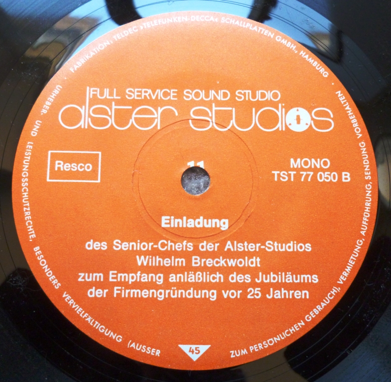Zufällig fällt sie mir gerade wieder in die Hände, die Single "25 Jahre Alster Studios". Wenn die 25 Jahre richtig sind, dann muss die Platte 1971 erschienen sein, gepresst bei Teldec.
