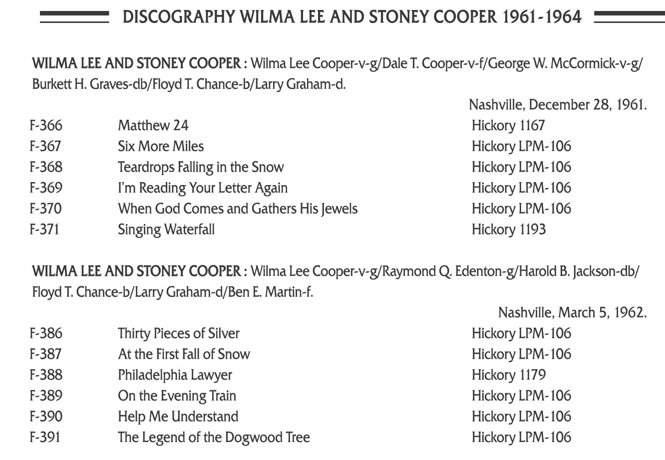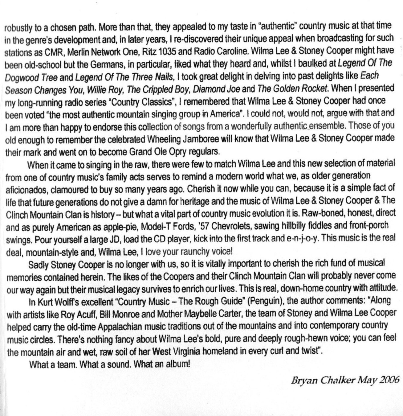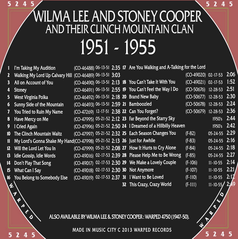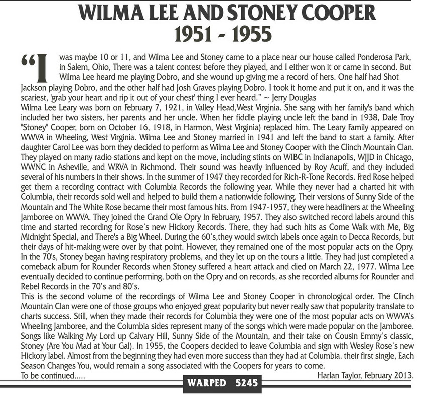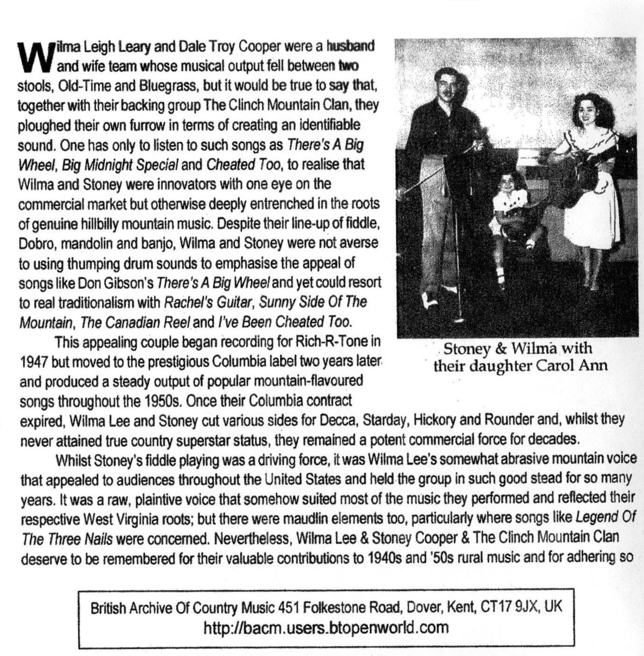 Die Country-Musikerin, Sängerin und Gitarristin Wilma Lee wurde am 7. Februar 1921 in Valley Head, West Virginia, als Wilma Lee Leary geboren und verstarb am 13. September 2011 in Sweetwater, Tennessee. Bereits in ihrer Jugend sang sie mit Eltern und Geschwister in einer eigenen Gospelmusik-Gruppe. 1939 heiratete sie den Sänger und Fiddler Stoney Cooper (geboren am 16. Oktober 1918 in Harman, West Virginia, als Dale Troy Cooper, verstorben am 22. März 1977), der bei den Leary Family Singers als Begleitmusiker tätig war. Gemeinsam mit befreundeten Musikern bildeten sie die Bluegrass-Formation Clinch Mountain Clan, wo sie für den Gesangspart, sowohl solo als auch im Duo zuständig waren.