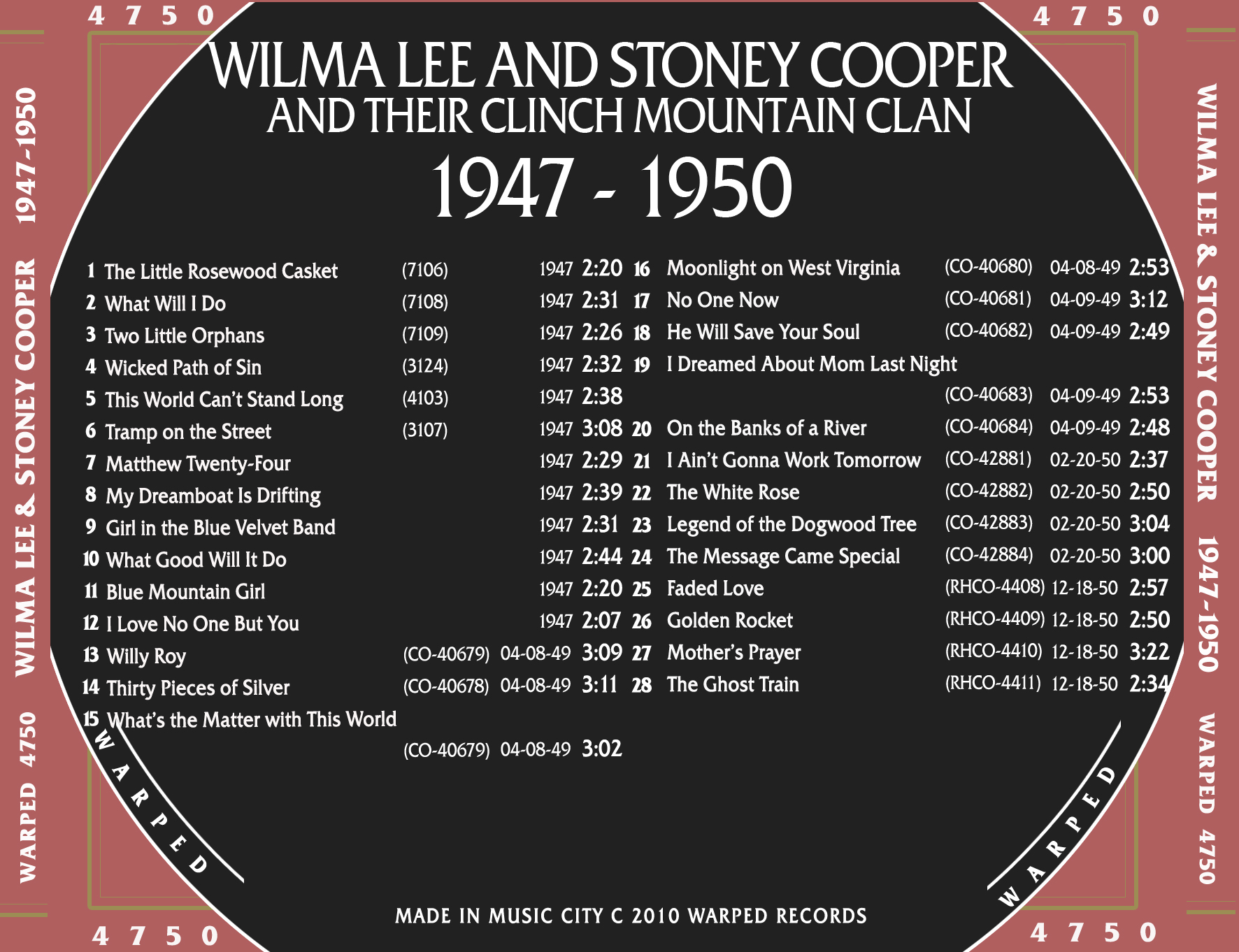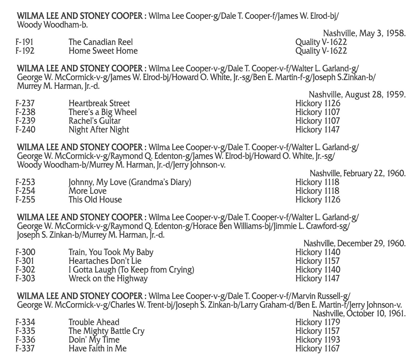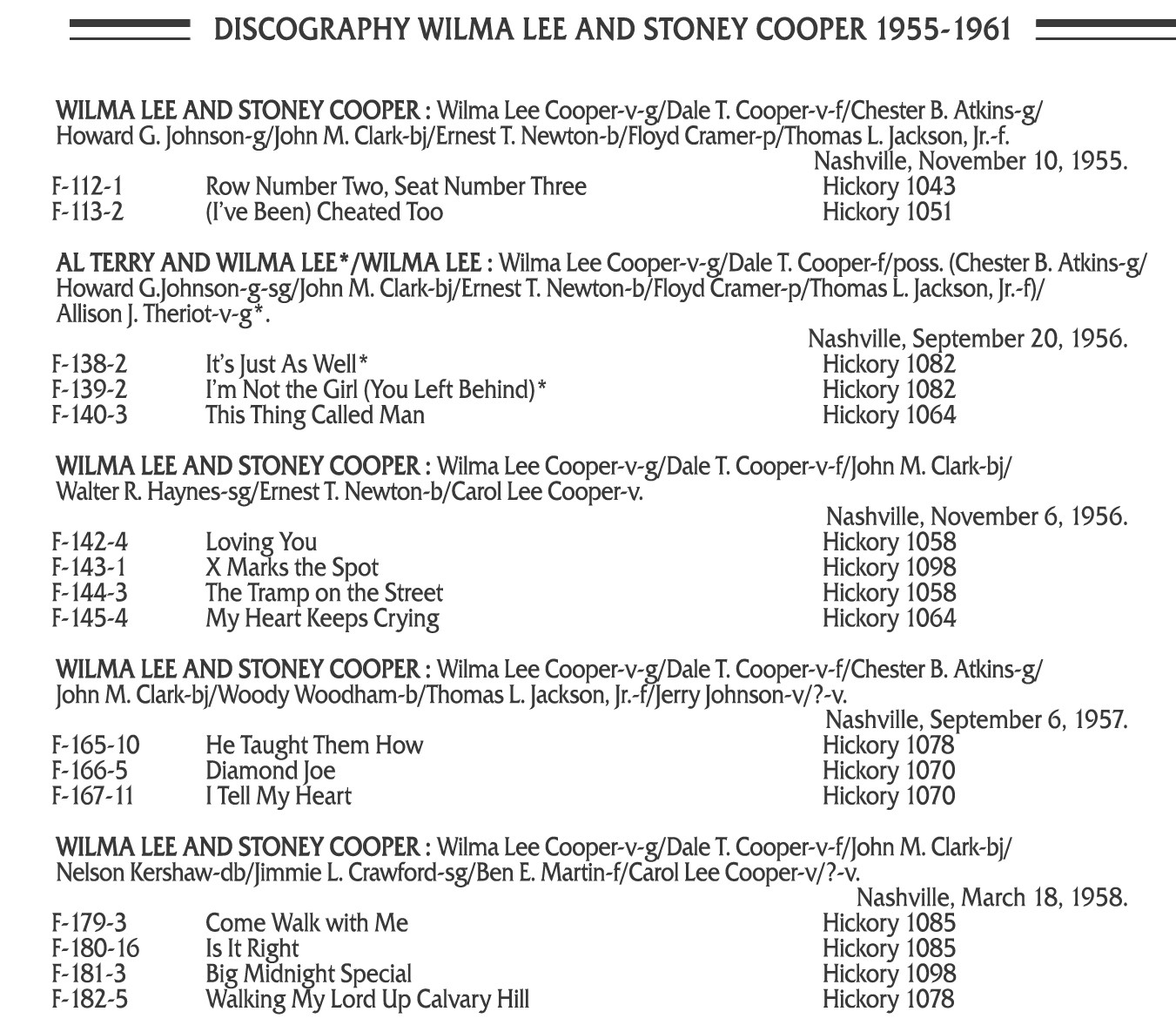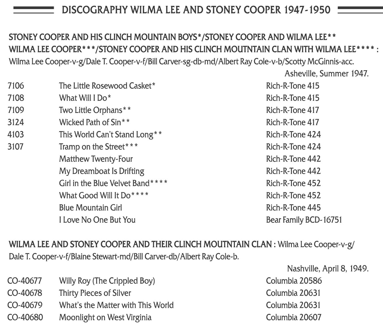 Die Country-Musikerin, Sängerin und Gitarristin Wilma Lee wurde am 7. Februar 1921 in Valley Head, West Virginia, als Wilma Lee Leary geboren und verstarb am 13. September 2011 in Sweetwater, Tennessee. Bereits in ihrer Jugend sang sie mit Eltern und Geschwister in einer eigenen Gospelmusik-Gruppe. 1939 heiratete sie den Sänger und Fiddler Stoney Cooper (geboren am 16. Oktober 1918 in Harman, West Virginia, als Dale Troy Cooper, verstorben am 22. März 1977), der bei den Leary Family Singers als Begleitmusiker tätig war. Gemeinsam mit befreundeten Musikern bildeten sie die Bluegrass-Formation Clinch Mountain Clan, wo sie für den Gesangspart, sowohl solo als auch im Duo zuständig waren.