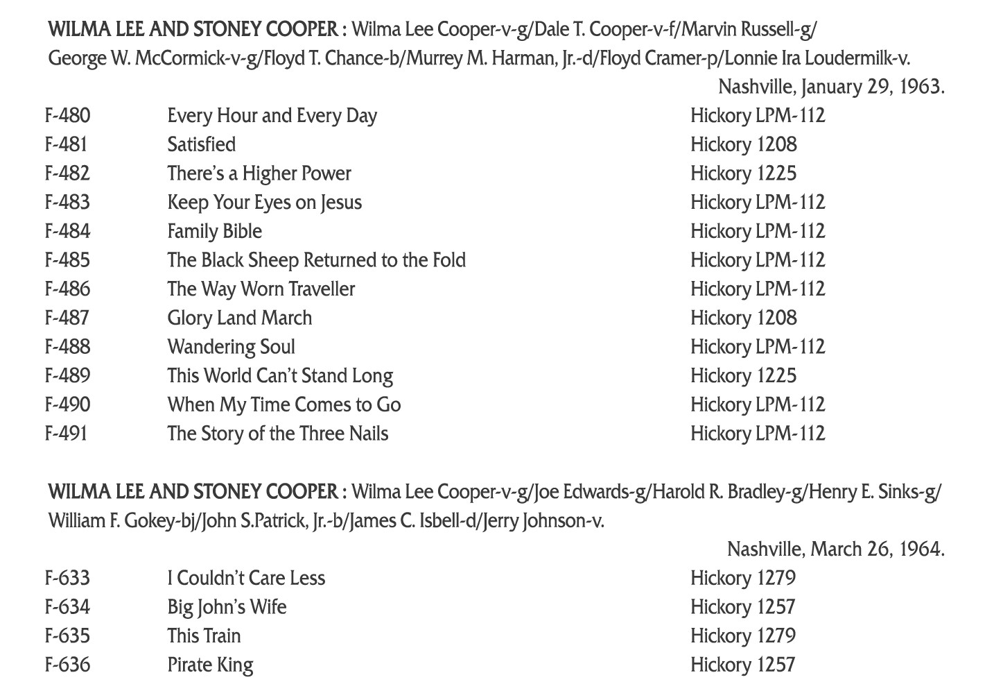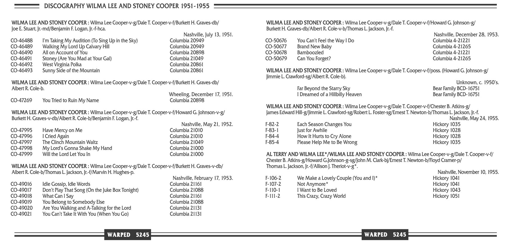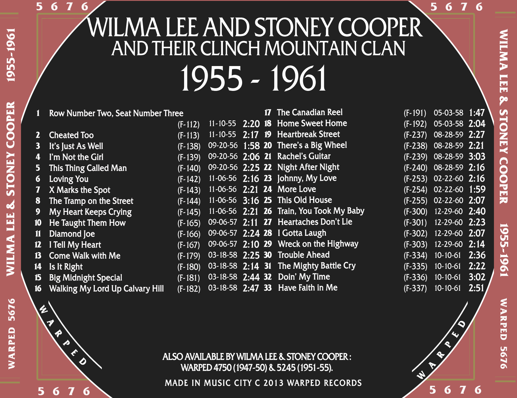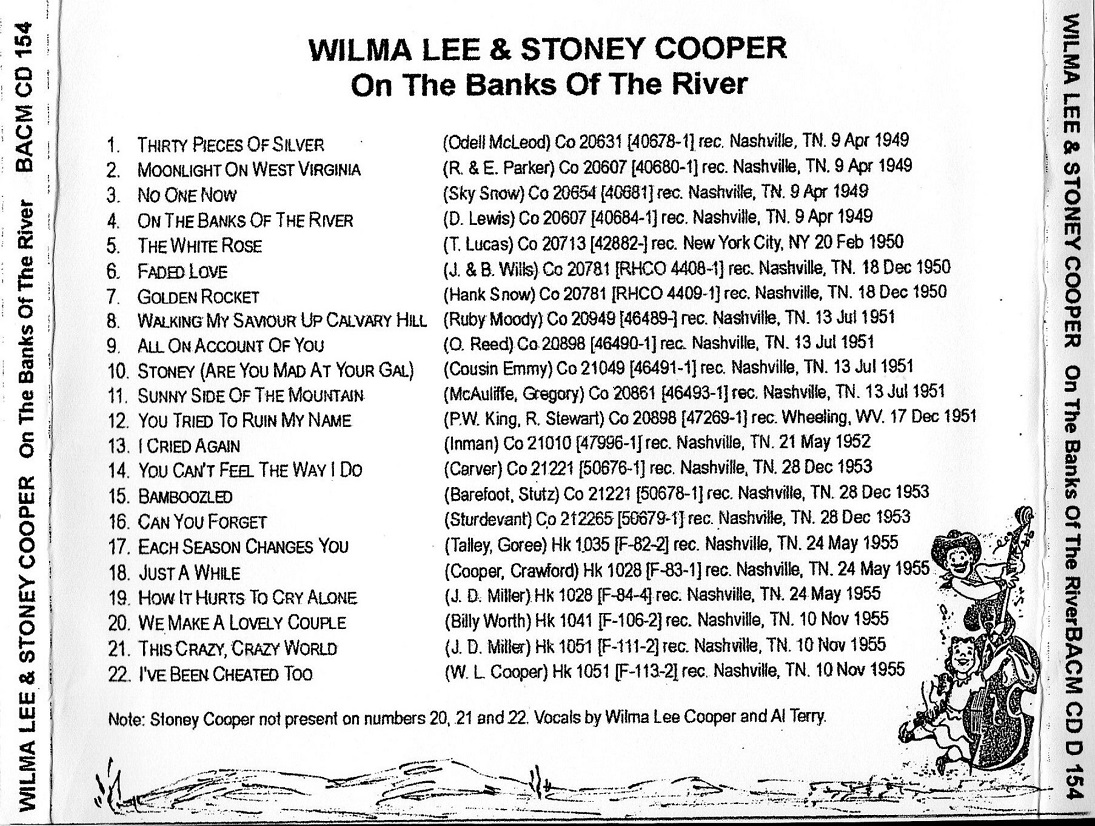 Die Country-Musikerin, Sängerin und Gitarristin Wilma Lee wurde am 7. Februar 1921 in Valley Head, West Virginia, als Wilma Lee Leary geboren und verstarb am 13. September 2011 in Sweetwater, Tennessee. Bereits in ihrer Jugend sang sie mit Eltern und Geschwister in einer eigenen Gospelmusik-Gruppe. 1939 heiratete sie den Sänger und Fiddler Stoney Cooper (geboren am 16. Oktober 1918 in Harman, West Virginia, als Dale Troy Cooper, verstorben am 22. März 1977), der bei den Leary Family Singers als Begleitmusiker tätig war. Gemeinsam mit befreundeten Musikern bildeten sie die Bluegrass-Formation Clinch Mountain Clan, wo sie für den Gesangspart, sowohl solo als auch im Duo zuständig waren.