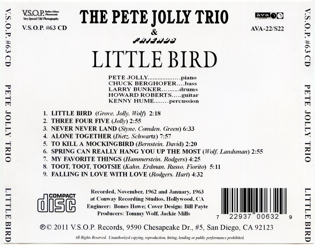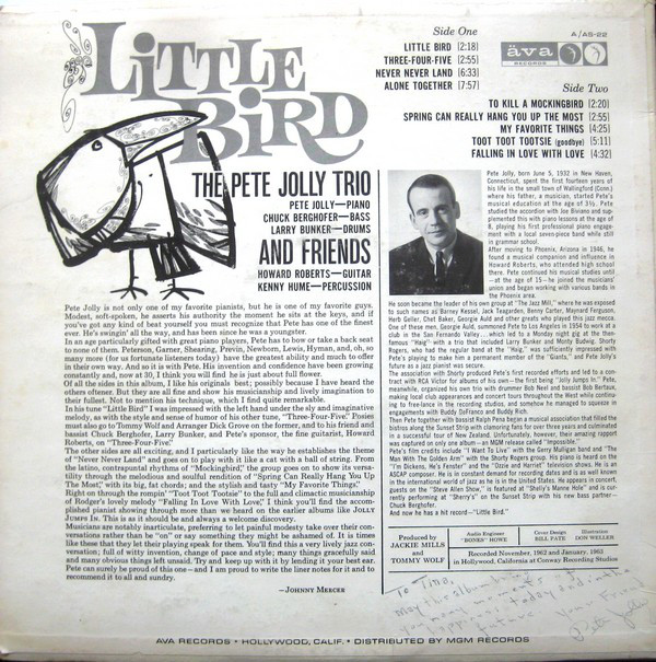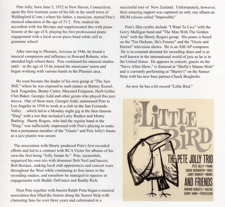 Seine Komposition „Little Bird“ (ein kleiner Hit auf Fred Astaires Label Ava) wurde 1963 für einen Grammy nominiert, als er das Pete Jolly Trio gründete. Mit dem Trio und als Solokünstler nahm er mehrere Alben auf, darunter eine Zusammenarbeit mit Jan Lundgren im Jahr 2000. Sein letztes Album, das er im Mai 2004 kurz vor seinem Tod in Phoenix aufnahm, war „It's a Dry Heat“ mit dem Saxophonisten Jerry Donato.
