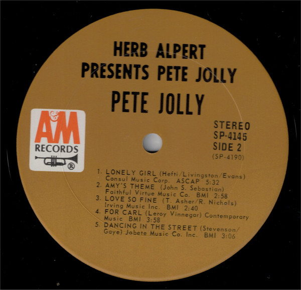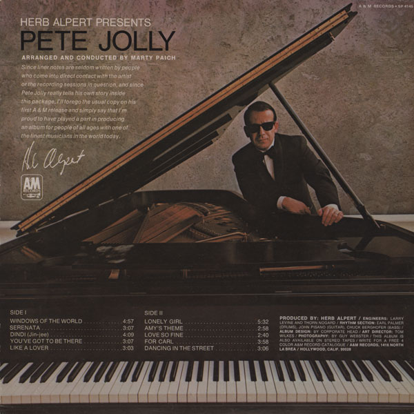 Er arbeitete auch mit anderen namhaften Jazzkünstlern zusammen, darunter Buddy DeFranco, Art Pepper und Red Norvo, und viele Jahre lang mit dem Arrangeur und Dirigenten Ray Conniff sowie Herb Alpert, der für Alperts Plattenlabel A&M sowohl als Sideman als auch als Bandleader aufnahm. Er ist in den ersten Takten von Alperts Nummer-1-Hit „This Guy's in Love“ von 1968 zu hören. Neben A&M hat Pete Jolly als Bandleader für Metrojazz, MGM, Ava, Charlie Parker Records, RCA, Columbia, A&M, Atlas, Holt und V.S.O.P. aufgenommen.