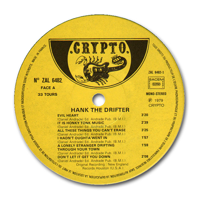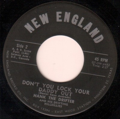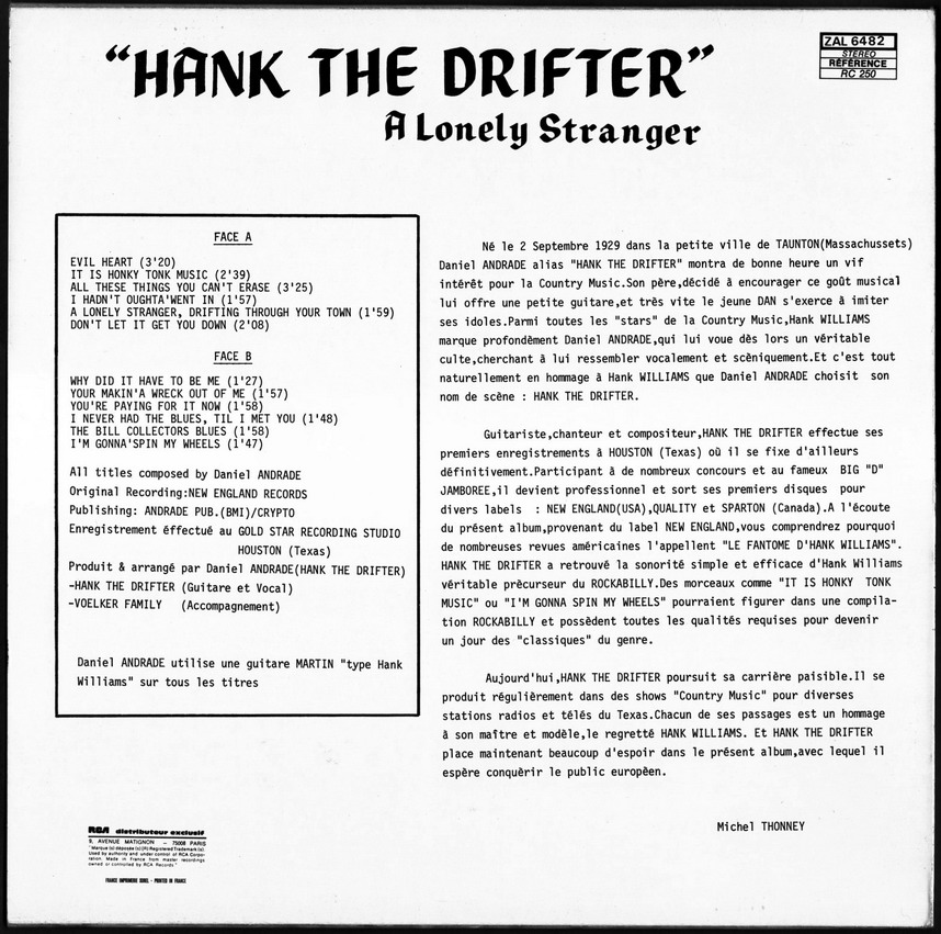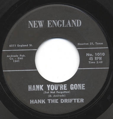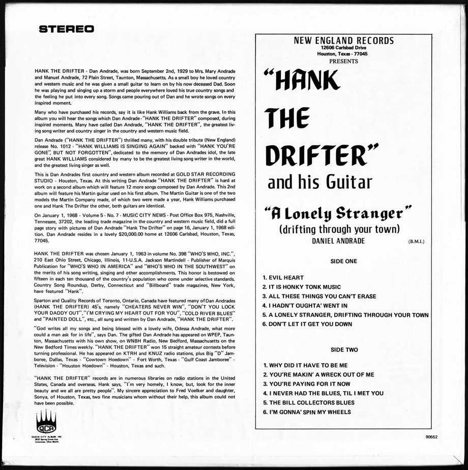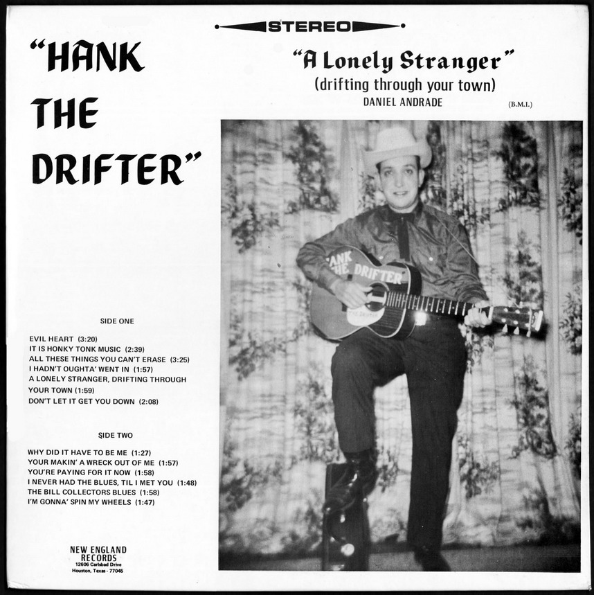 Der Sänger und Gitarrist Hank The Drifter bzw. Joe Lombardie wurde am 2. September 1929 in Taunton, Massachusetts, als Daniel Raye Andrade geboren. Schon als kleiner Junge liebte er das Landleben und die Westernmusik und auf einer kleinen Gitarre die ihn sein Vater schenkte übte er fleißig die Songs. Etwa 1955 gründete er sein eigenes Label NEW ENGLAND und war auch als Songwriter tätig. Nach einer längeren Pause ab etwa 1956 reaktivierte er 1961 wieder sein Label und verwertete seine Einspielungen aus den Fünfzigern. Teilweise war auch unveröffentlichtes Material dabei. Beispielsweise ist "Hank Williams Is Singing Again" auf NEW ENGLAND 235 nicht mit der Aufnahme auf seiner ersten Single ident.