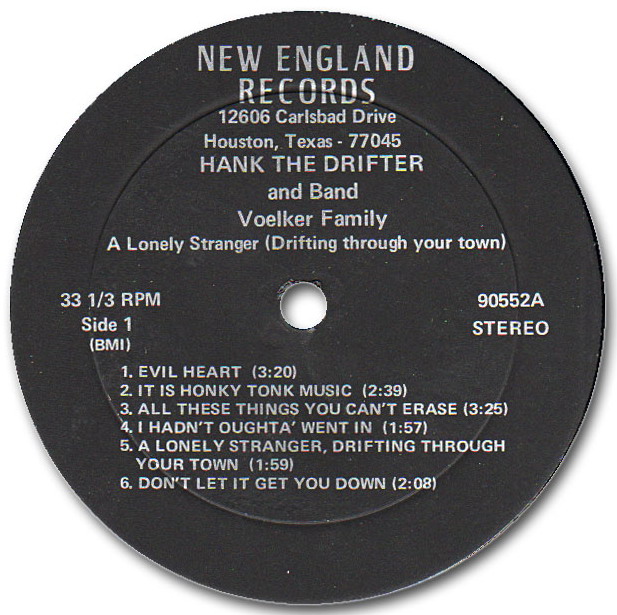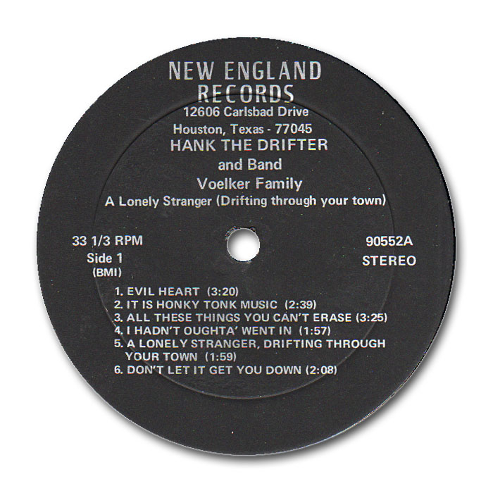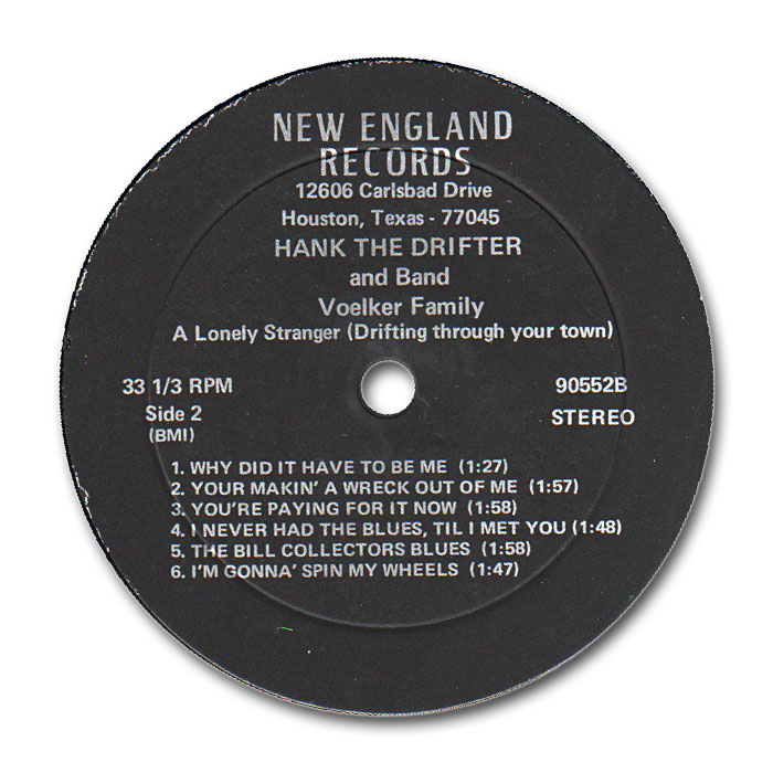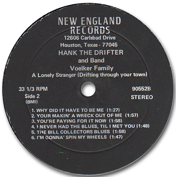 ?? ??….No. 1022….HANK THE DRIFTER Vocal & Band: Voelker Family Lead-Guitar: Ken McBurnett Guitar: Mary Ann Voelker Guitar: Dan Andrade Bass: Fred Voelker..Hank Williams Is Singing Again (LH-11512)/She Was Gone (LH-11513)