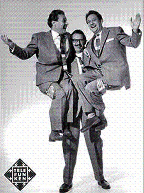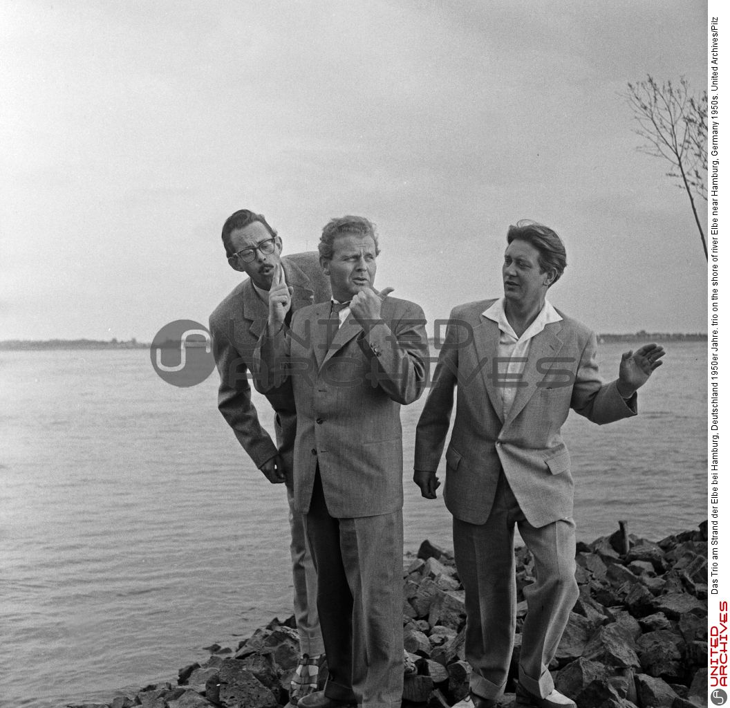 Aus dem Jahr 1957, wohl am Ufer der Elbe in/bei Hamburg habe ich hier weitere drei Herren. Diesmal habe ich (zur besseren Identifizierung) drauf geachtet, daß das UA-Wasserzeichen nicht mitten durch Gesichter läuft.