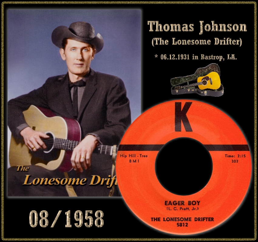 Der Country- und Rockabilly-Musiker The Lonesome Drifter wurde am 6. Dezember 1931 in Bastrop, Louisiana, als Thomas Johnson geboren. In den Fünfzigern begann er seine Musiker-Karriere, die sich überwiegend im Country-Bereich abspielte. Als er hörte, dass in Shreveport ein neues Label gegründet wurde machte er sich auf den Weg zu Mira Smith, der Label-Besitzerin des neuen Labels RAM die ihm die Gelegenheit gab eine Single einzuspielen, die dann auf K, einem Sublabel von RAM, veröffentlicht wurde. Zumindest die A-Seite war mehr Rockabilly als Country. Im folgenden Jahr gab es noch eine Single auf dem Haupt-Label RAM. Als Musiker war er in der Region recht erfolgreich, als Plattenstar eher nicht. Vielleicht wollte er das auch garnicht, denn das Pseudonym wählte er nur, weil er nicht mit seinem richtigen Namen auf der Platte aufscheinen wollte. Etwa neun Einspielungen blieben unveröffentlicht.