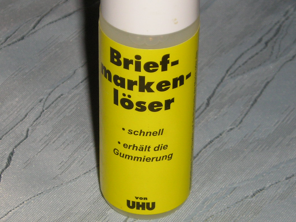 Dieser Briefmarkenlöser ist in guten Schreibwarengeschäften oder im Briefmarkenhandel erhältlich und kostet um die 4€. Der Inhalt dürfte mindestens für 100 Etiketten reichen und auch auf "normalen" Labeln sicherer als Entfernung mit Wasser.