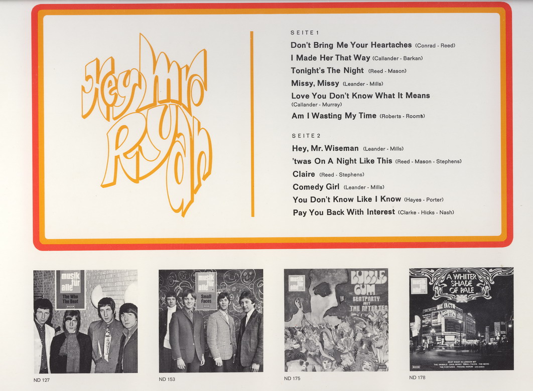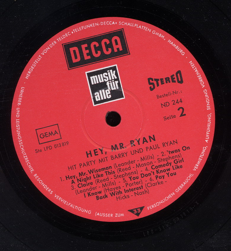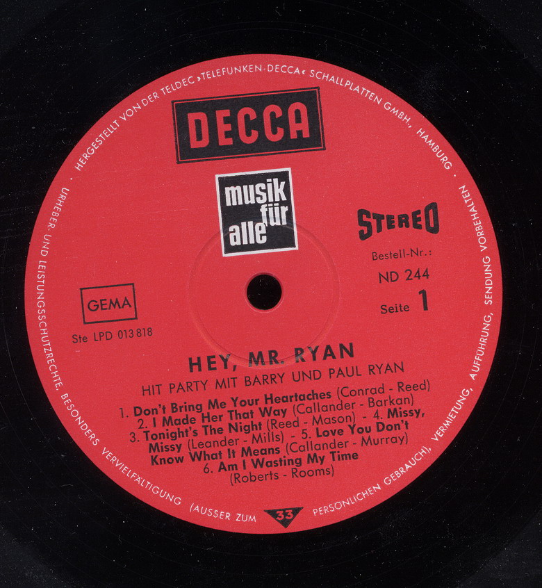 Wie die Beatles oder Mary Hopkin sang Ryan auch Lieder in Deutsch, wie z. B. Zeit macht nur vor dem Teufel halt, das in Deutschland 1972 ein Top-10-Hit wurde.