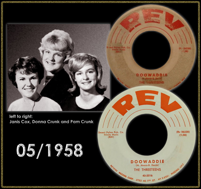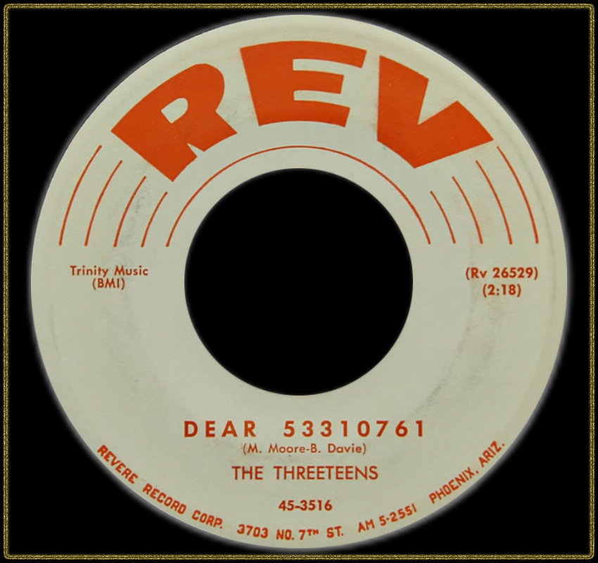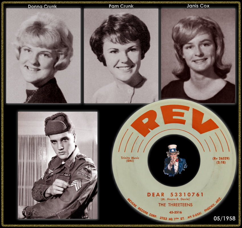 Wer die drei Mädels waren die die Threeteens bildeten, konnte ich bisher leider nicht herausbekommen. Jedenfalls brachten sie zwei Singles auf den Markt, ven denen die zweite bei einer anderen Firma sogar nochmals aufgelegt wurde. Ganz interessant ist ihre erste Single, wo sich die A-Seite an Elvis richtet aber nicht mit seinem Namen, sondern mit seiner Armee-Seriennummer. Schon etwas skurril. Noch ein interessantes Detail dazu, auch Duane Eddy hat, zumindest bei ihrer ersten Single, mitgewirkt.
