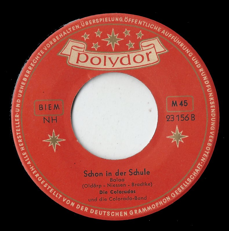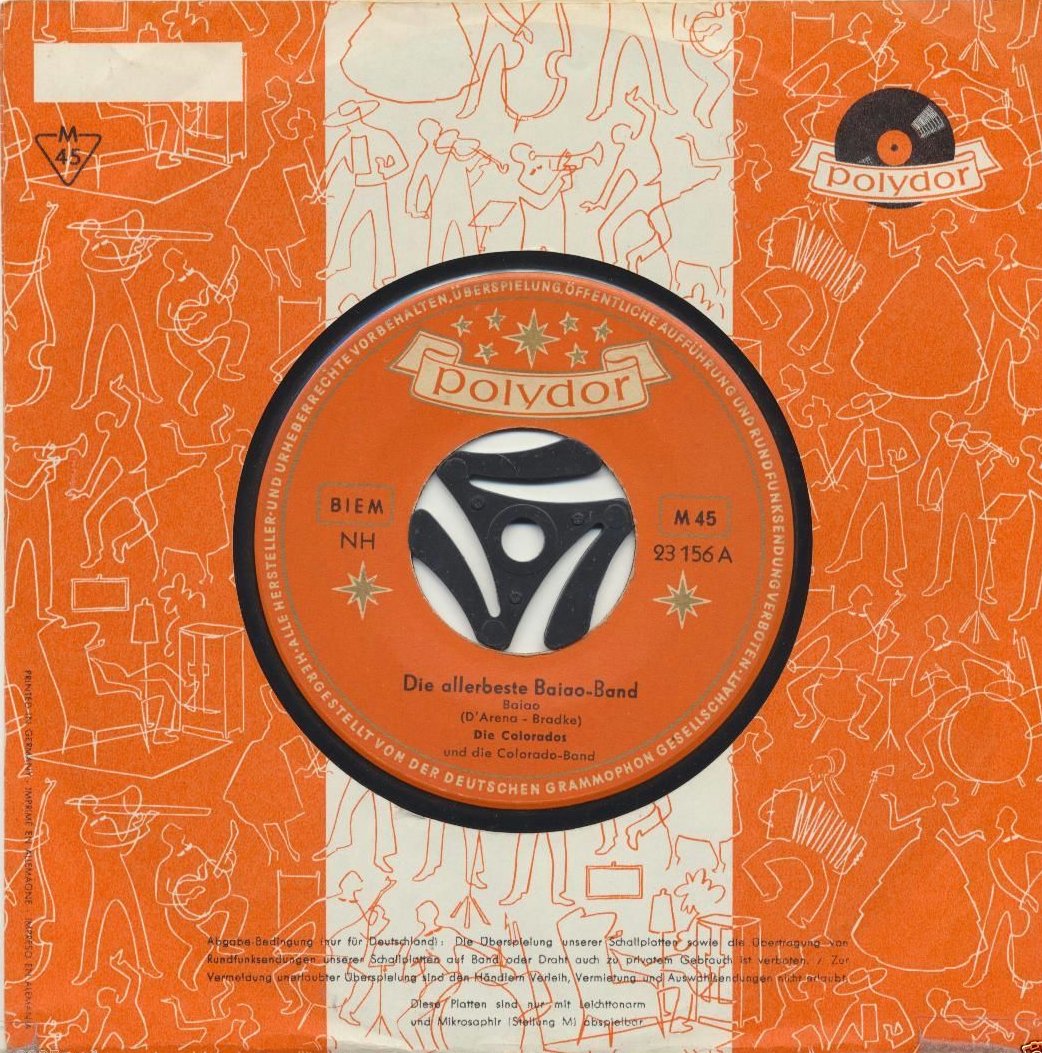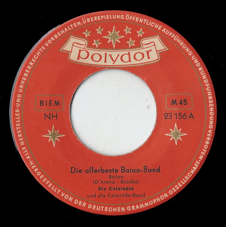 COLORADOS, Die (RUDI KREUZBERGER, seine Frau LENA DORS, BOBBY WILLS, LIANE PETERS), Gesangensemble, 1956 Polydor (23156 "Die Allerbeste Baiao-Band"/"Schon In Der Schule" & Die COLORADO-Band, 23310 "Brasil-Expreß (Choo-Choo-Cha-Cha)"/"In Florenz" & Orchester MAX GREGER)