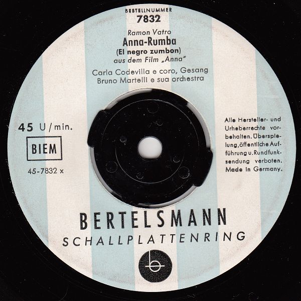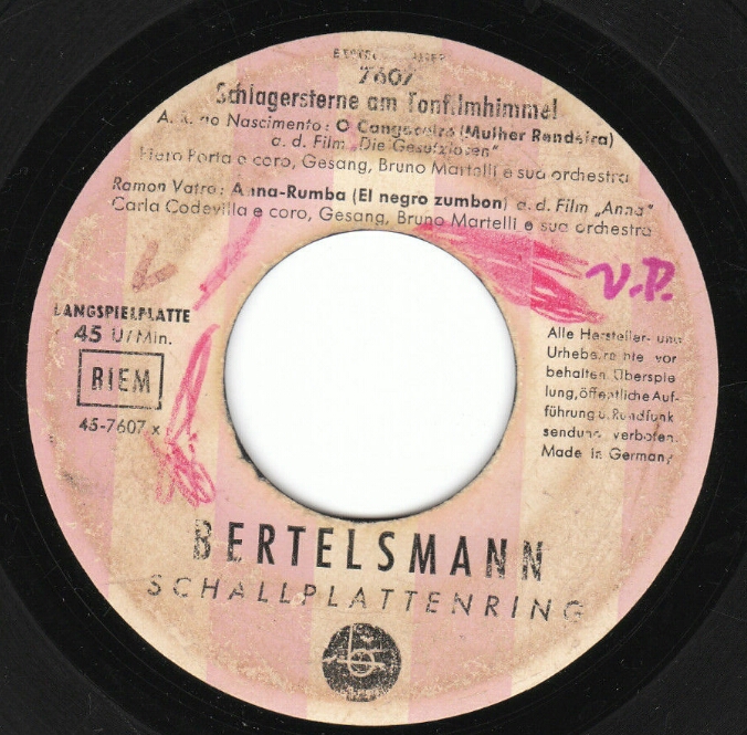 Bertelsmann (u.a. "Come Prima"/"Piccolissima Serenata" & Das Orch. BRUNO MARTELLI, 1959 Bertelsmann LP 31708 "Das Klingende Schlageralbum 1959 ("Tschau, Tschau, Bambina" & Das Orchester BRUNO MARTINELLI)),