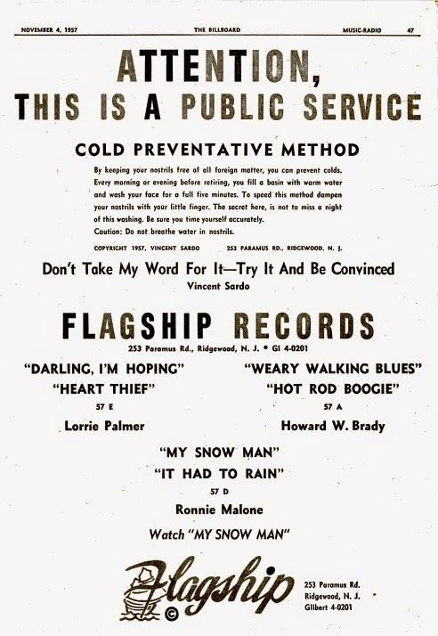 Beim FLAGSHIP-Label gibt es einen interessanten Vorgang, der zumindest mir, bisher nicht bekannt war. Die erste Single der Firma weist auf dem Label nur eine gekürzte Orchester-Angabe aus und erst die zweite Ausgabe, die auch im Billboard vom 14. Oktober 1957 vorgestellt wurde, enthält nähere Angaben über den Vokalisten.