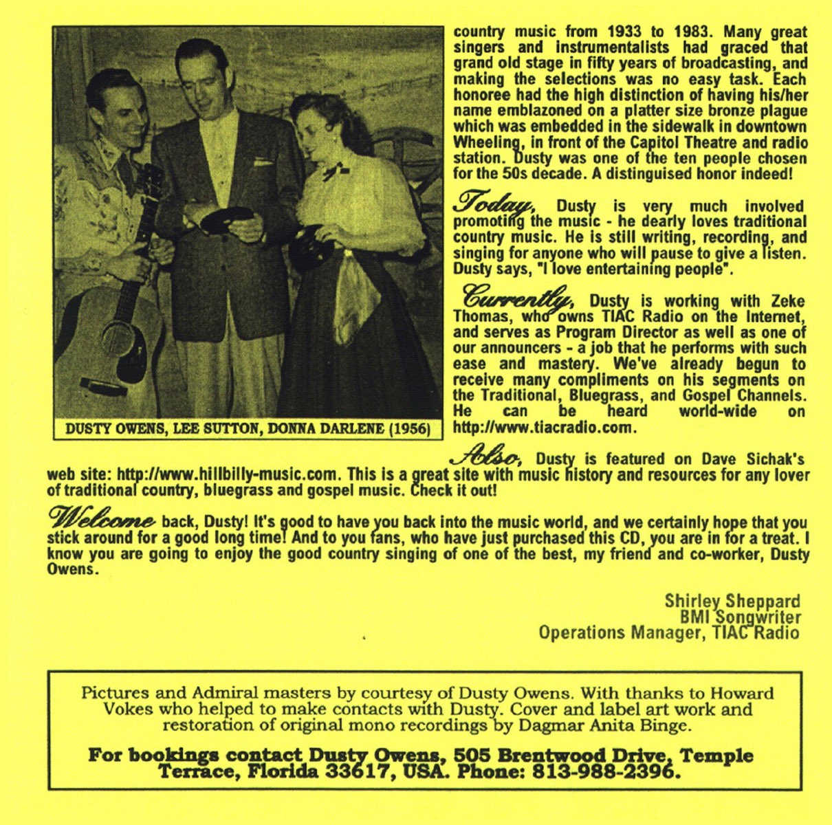 Dusty Owens wurde am 2. September 1930 in Fairdealing, Missouri, geboren. Die Familie zog dann später nach Flint, Michigan. Bereits ab 1948 war Dusty bei diversen Radiostationen als Musiker tätig. In den Fünfzigern war er in West Virginia der "Early Star Of The Wheeling Jamboree".