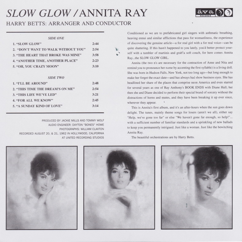 Die Sängerin Annita Ray wurde in Hudson Falls im Bundesstaat New York geboren und hatte ihr Debut als Sängerin 1956 in dem "Fats Domino"-Film "Shake, Rattle And Rock" (links klicken), wo sie den Titel "Rockin' On A Saturday Night" sang, der aber nicht auf Platte gepresst wurde. Ihre erste Single-Veröffentlichung gab es erst 1957 und dann tröpfelte es bis 1966 so dahin. Nach Ray Anthony als Bookends mit Diane Hall wechselte sie zu den Fred Astaire-Labels CHOREO und ÄVA, die von M-G-M vertrieben wurden (daher in Großbritannien auf M-G-M) und da ging sich zwischen zwei Singles sogar ein Album aus. 1965 bildete sie mit Diane Hall neuerlich ein Duo, dass sich schlicht und einfach Diane & Annita nannte.
