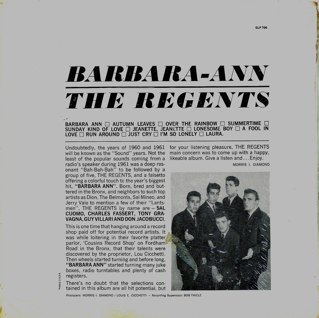 Ralf hat in diesem Beitrag (links klicken) über das Gesangs-Quintett The Regents bereits kurz berichtet, da ging es aber nur um ihren Hit "Barbara-Ann", den die Beach Boys fünf Jahre später zum Million-Seller machten.