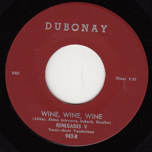 Schon vor Jahren habe ich die DUBONAY-Single der Renegades V erworben da mir erklärt wurde, dass sie aus dem Jahre 1960 stammt. Ihre Version von "Wine, Wine, Wine" hat mich damals überzeugt und im falschen Glauben gelassen. Erst Jahre später kam ich dahinter, dass diese Daten nicht korrekt waren. Ihr "Wine, Wine, Wine" war zwar als rocknrolliger Gegen-Angriff auf die "Britische Invasion" gedacht, womit auch ein vager Zusammenhang mit dem Rocknroll vorhanden ist.