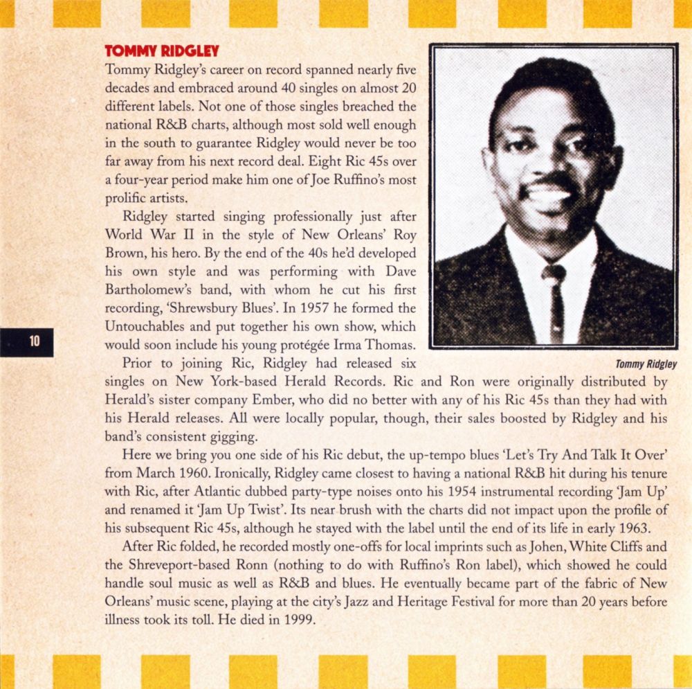 Der Bandleader und R&B-Sänger Tommy Ridgley wurde am 30. Oktober 1925 als Thomas Herman Ridgley in New Orleans, Louisiana, geboren und verstarb am 11. August 1999 im East Jefferson Hospital, New Orleans, Louisiana, an Lungenkrebs.