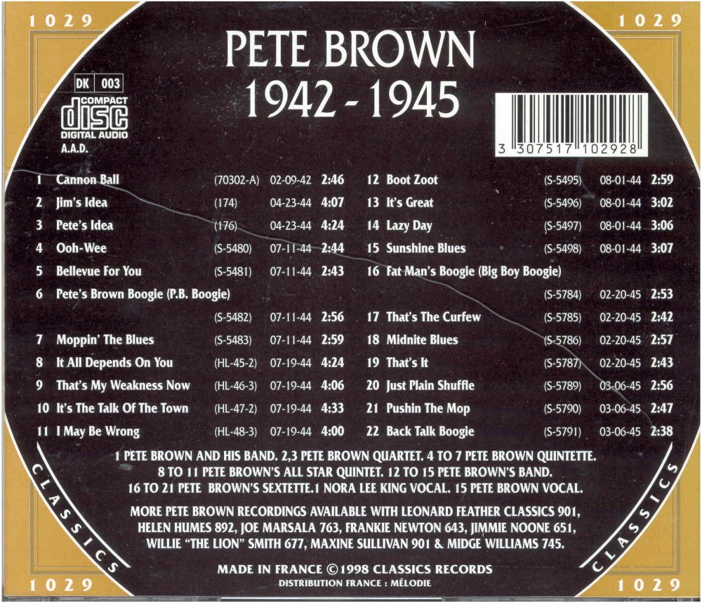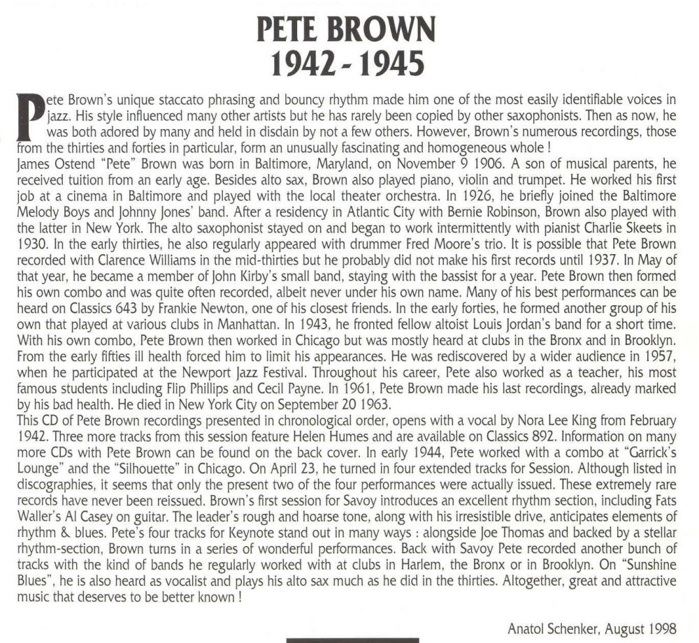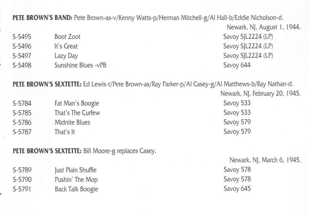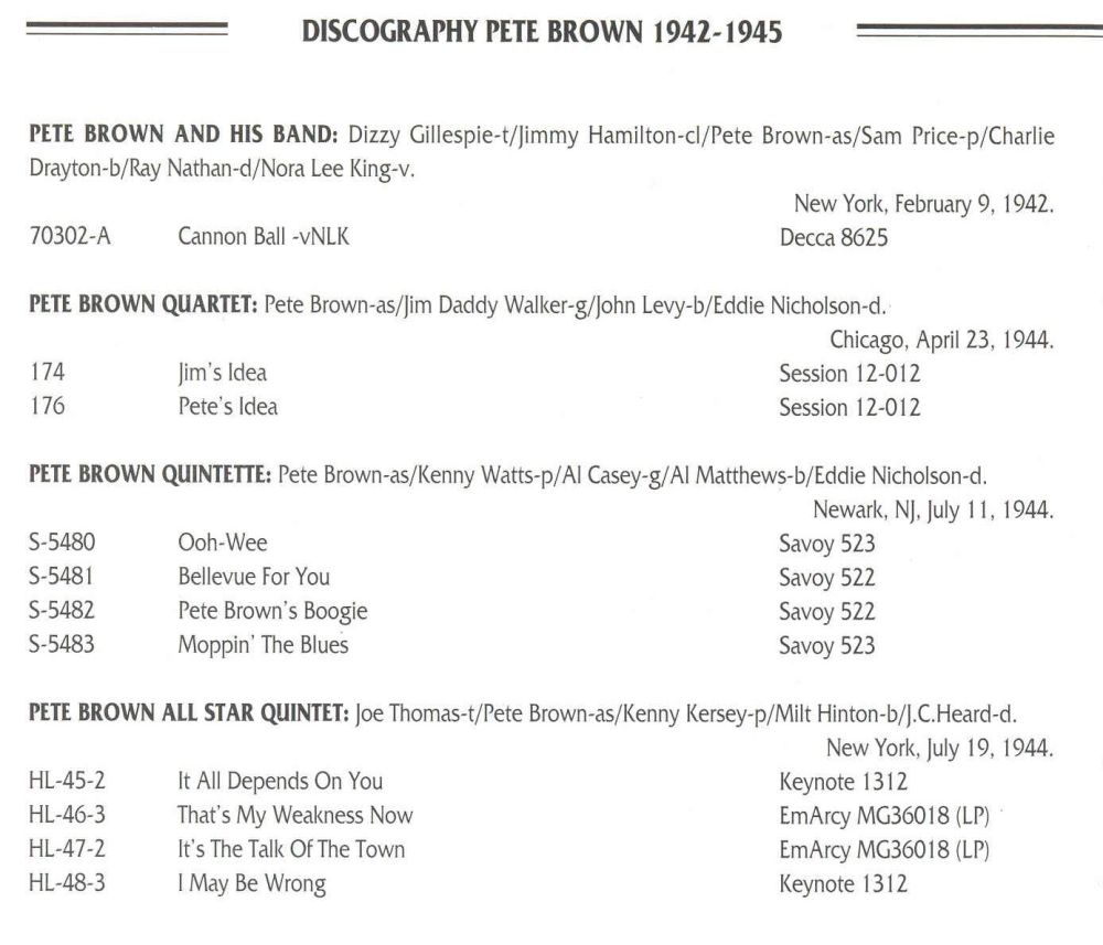 Pete Brown begann im April 1939 unter seinem eigenen Namen aufzunehmen und legte einen fulminanten Start hin. Seine erste Gruppe nannte er eine „Jump Band“ und besetzte sie mit ebenso erfahrenen und talentierten Musikern wie sich selbst. Stilistische Veränderungen zeichneten sich ab, als er 1942 mit Dizzy Gillespie, Jimmy Hamilton und dem Pianisten Sammy Price ein Sextett gründete. Brown trat unermüdlich in Clubs auf und tourte häufig zwischen New York, Boston und Chicago.