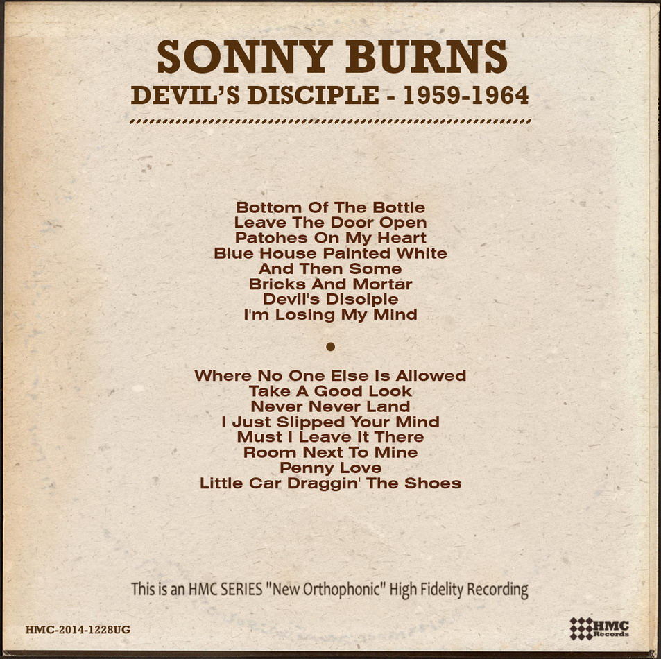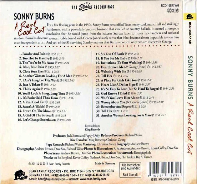 Sonny Burns startete seine Karriere in Eddie Noacks Band, bevor er nach Galveston zog. Schon damals war er Mitglied des K-NUZ Houston Hometown Jamboree, einer Radiosendung, die jeden Samstagabend live gesendet wurde. Während einer dieser Shows heiratete er vor Publikum am 22. Mai 1954 im City Auditorium. Jedoch hielt die Ehe nicht lange. Im selben Jahr traf er den jungen George Jones bei einem Freund. Jones war gerade aus der Armee entlassen worden und versuchte sich nun als Musiker. Die beiden Sänger wurden schnell Freunde und traten zusammen in kleinen Clubs und Bars auf. Im selben Jahr bekam der trinkfeste Burns eine Anfrage der Starday Records, Platten aufzunehmen. Zusammen mit Jones nahm er seine ersten beiden Titel für Satday 45-165 (siehe oben) auf, die sich gut verkauften.