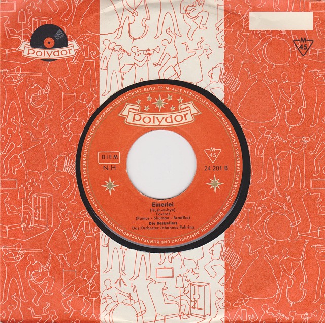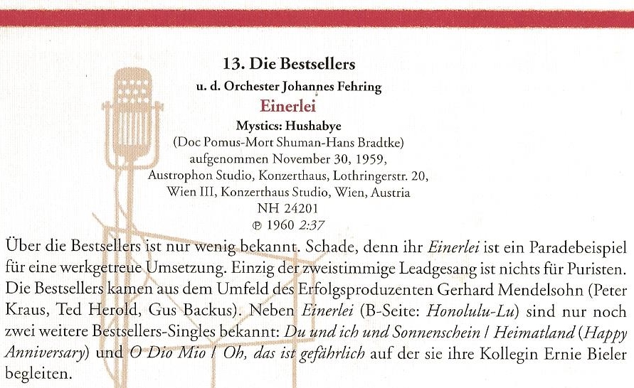 keine Ahnung, wer sich hinter den Bestsellers verbirgt. Die Seemannsschnulze "Honolulu Lu" (im Stil der Blauen Jungs) ist auch nicht übermäßig interessant. "Einerlei" auf der B-Seite dafür umso mehr: es ist eine gelungene deutsch gesungene Version des Mystics-Hits "Hushabye". Ein Bestseller wurde die Platte jedenfalls nicht.
