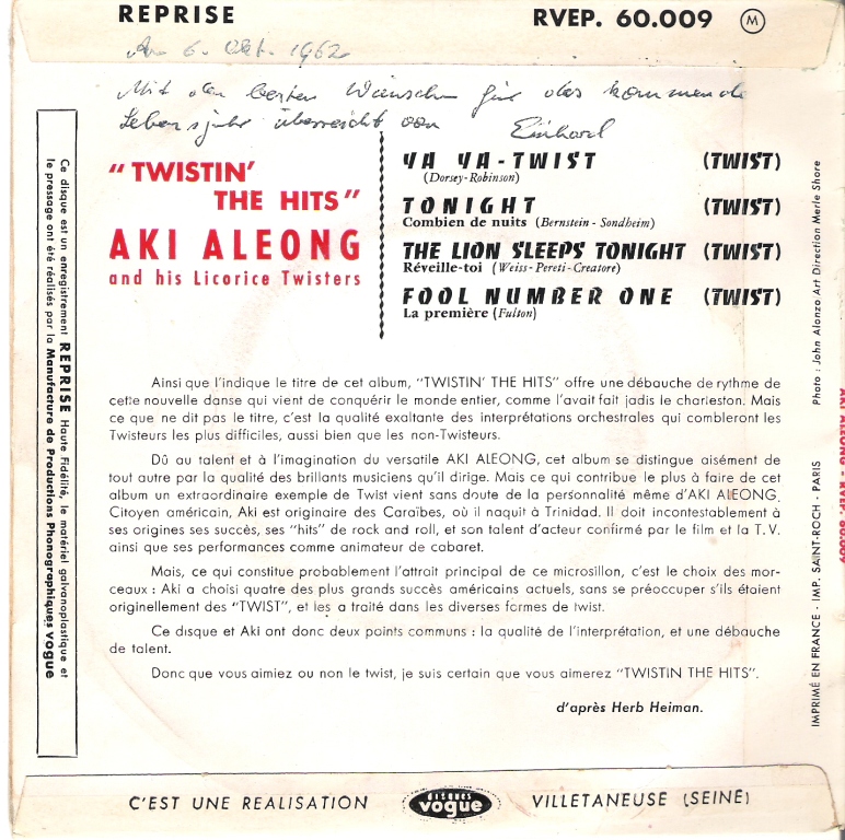 auf der vorgestellten EP von Aki Aleong & his Licorice Twisters lohnt sich im Grunde nur ein Song, aber der hat es in sich: "Ya Ya Twist" - wie die anderen drei Stücke auch - eine Instrumentalversion eines Hits (von Lee Dorsey, Joey Dee, Tony Sheridan, Johnny Halliday, Dalida etc. pp.) ist ein echter Knaller! Wer die Gitarre spielt (Mr. Aleong selbst oder jemand anderes), weiß ich nicht, aber dies ist eine Version, auf die ein Link Wray stolz sein könnte!