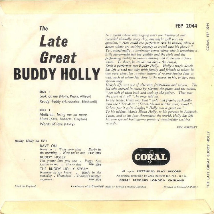 Coral FEP 2003 (Hüllen-Rückseite: 09/1962) Anhänge an diesem Beitrag Dateiname: Holly,Buddy108b.jpg Dateigröße: 156.43 KB Titel: Holly,Buddy108b.jpg Heruntergeladen: 354 Dateiname: Holly,Buddy108a.jpg Dateigröße: 461.62 KB Titel: Holly,Buddy108a.jpg Heruntergeladen: 373