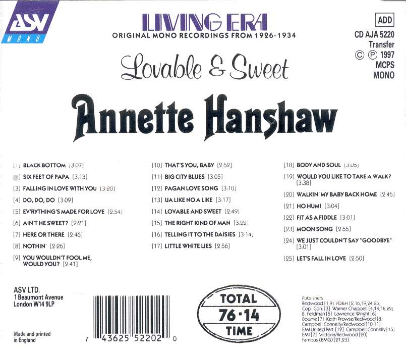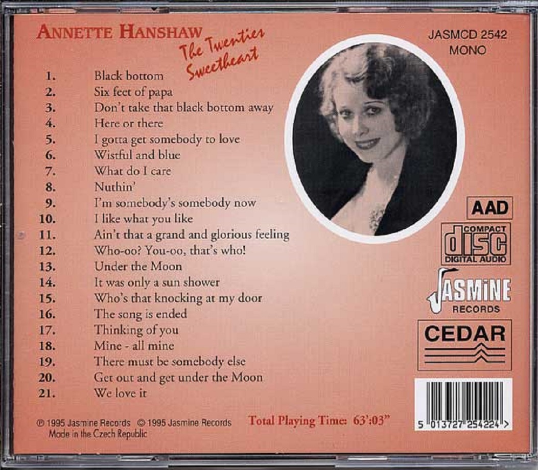 Annette Hanshaw zählte zu den populärsten Sängerinnen der späten 1920 er und frühen 1930 er Jahre. Hanshaw entdeckte schon früh ihre Liebe zum Singen und orientierte sich anfangs an Vorbildern wie Frank Fay, Sophie Tucker und Marion Harris. Ihr Vater, ein wohlhabender Hotelier, erfüllte ihr den Wunsch nach einem eigenen Musikgeschäft und verschaffte ihr Auftritte in seinen Hotels und auf seinen Partys.