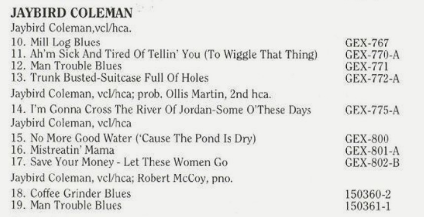 | Information: | JAYBIRD COLEMAN - COFFEE GRINDER BLUES |