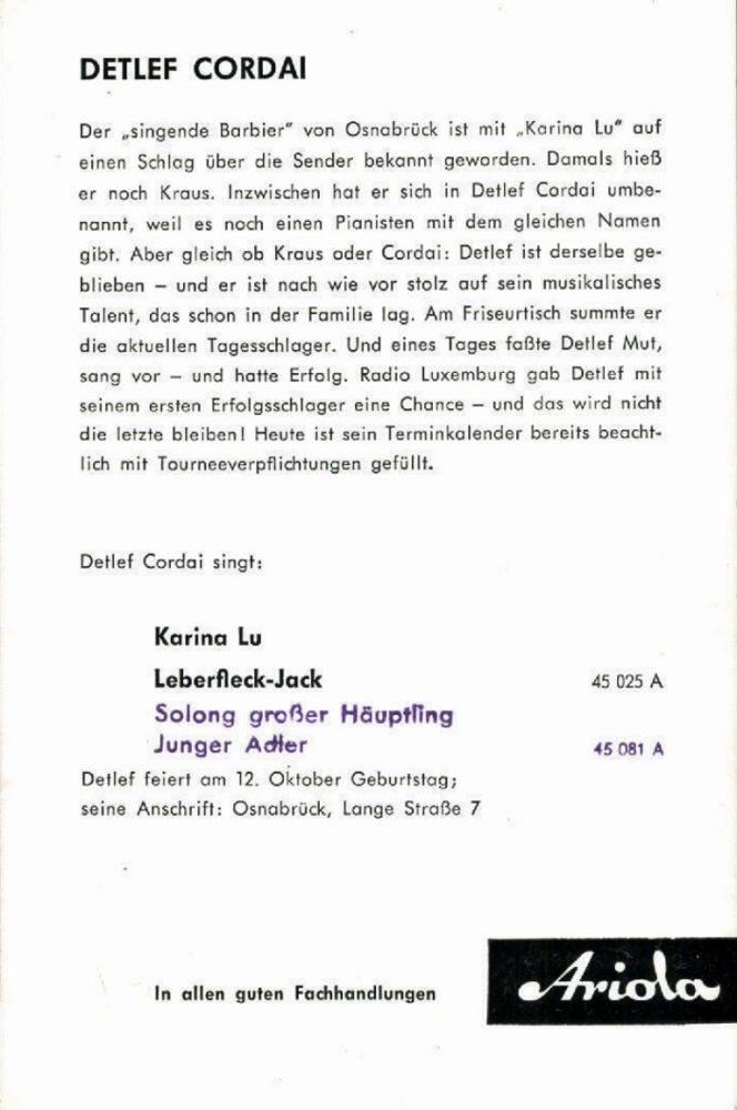 wer hat noch die Ariola Single 45025 von Detlef Kraus: